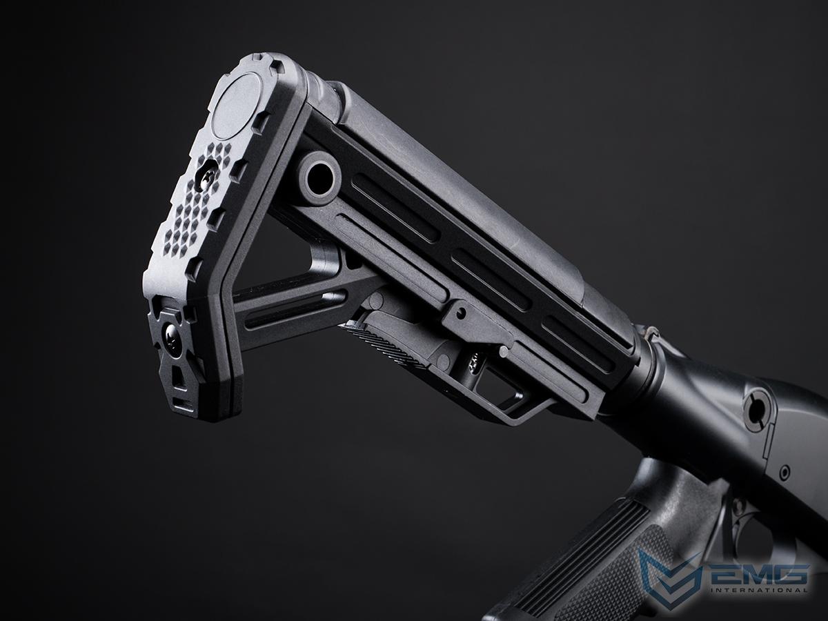 In close collaboration with Strike Industries, EMG has utilized some of the best licensed accessories into this M870 shotgun! Starting with the Airsoft version of the heavy duty "Valor of Action" M-LOK handguard built with durable aluminum provides easier pump action, introduces an aggressive look, and allows the user to maximize customization with 10 M-LOK slots for grips and accessories. On the front end attached is an aluminum barrel clamp providing a Picatinny rail on the 3 o'clock for lasers and light along with a QD sling point on the 9 o'clock. Lastly, the ejection port is equipped with a dust cover to protect internals, shot selector and laser engraved with authentic Strike Industries logos.