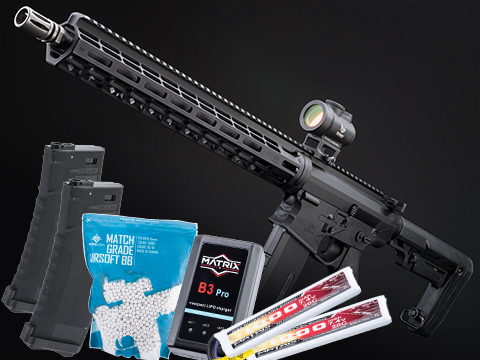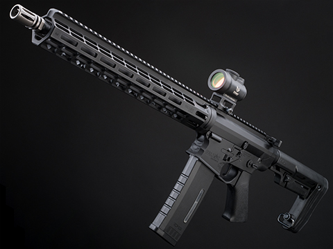 The Falkor Recce from EMG starts with a metal upper and lower receiver unlike any other AEG on the market. With extensive tactical styling, this receiver is bar none. In addition to the unique styling of the Falkor, nearly every piece is ambidextrous including the magazine catch, bolt release, short throw fire selector and a Falkor Mach 15 Ambi-charging handle is also present to complete the high end look of this rifle. A Super Dynamic 3-Gun Trigger style straight trigger gives the operator a unique and fast trigger manipulation. The Flared Magwell grip features ridges on the front for operators who prefer a magwell style grip on their rifle. It should also be noted that the upper receiver sports a unique style that will set the look apart from every other M4 variant on the market. Moving onward you will find a flush top rail leading into Falkor's Transitional Free-Float 14.6 M-LOK Handguard, allowing the end user to install any M-LOK compatible accessories and rail segments. The furniture of the Falkor Recce is also optimized for performance, modularity and comfort. A textured, slim profile motor grip paired with the Minimalist Stock not only completes the look of the rifle, but makes it an extremely comfortable piece to shoulder and field.