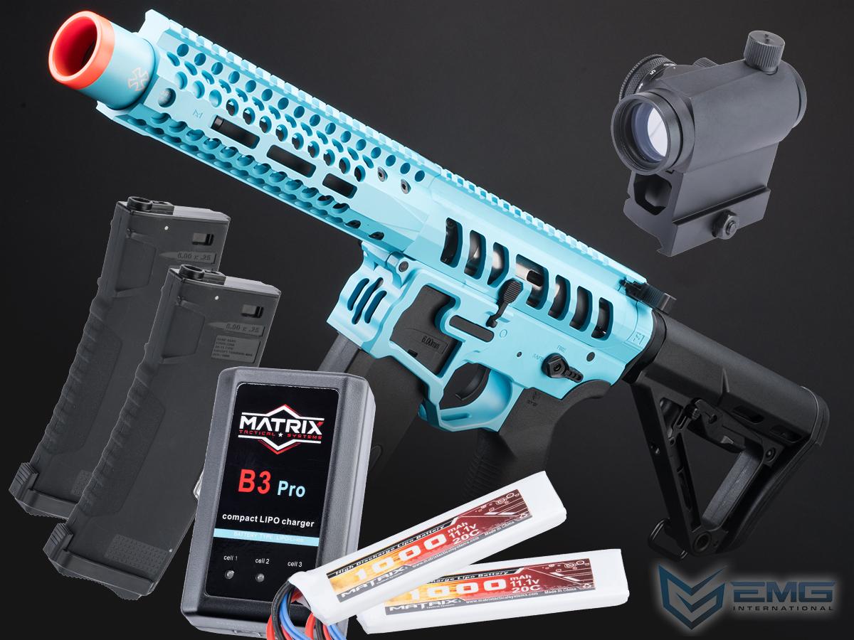 Package Includes: Gun, Magazine, 2x Spare BAMF Gen2 Mid-Cap Magazines, T1 style Red Dot Optic, 2x Matrix 11.1v LiPo Batteries, LiPo Balancing Smart Charger, LiPo Safe Charging Bag, Airsoft Safety Sack