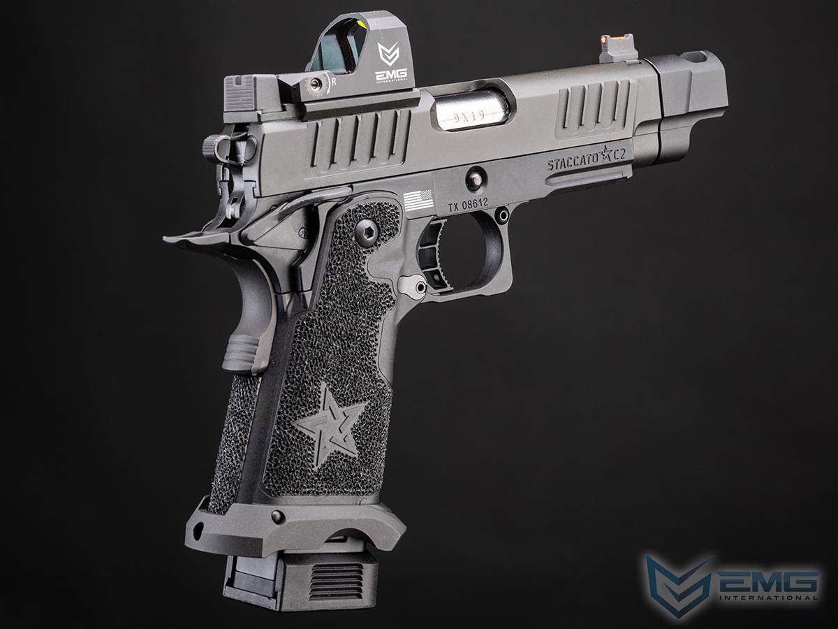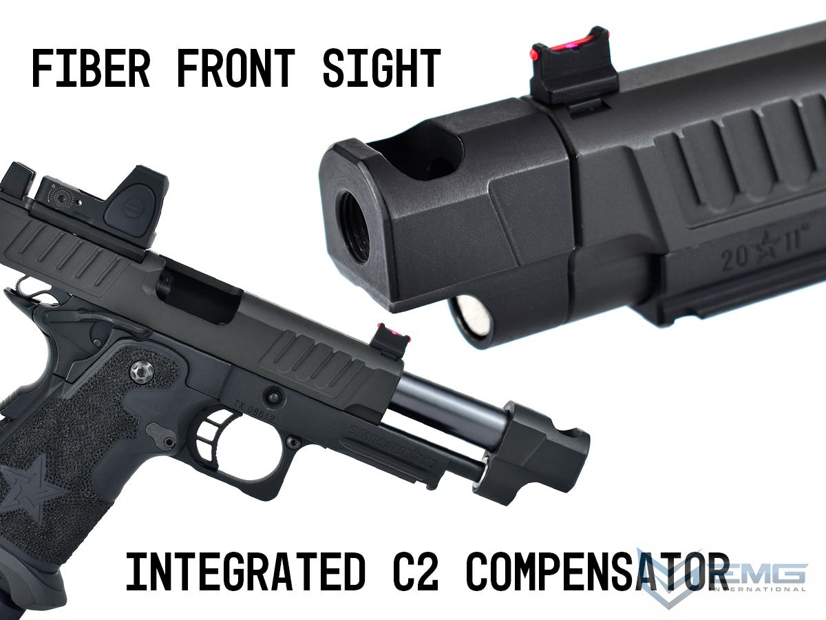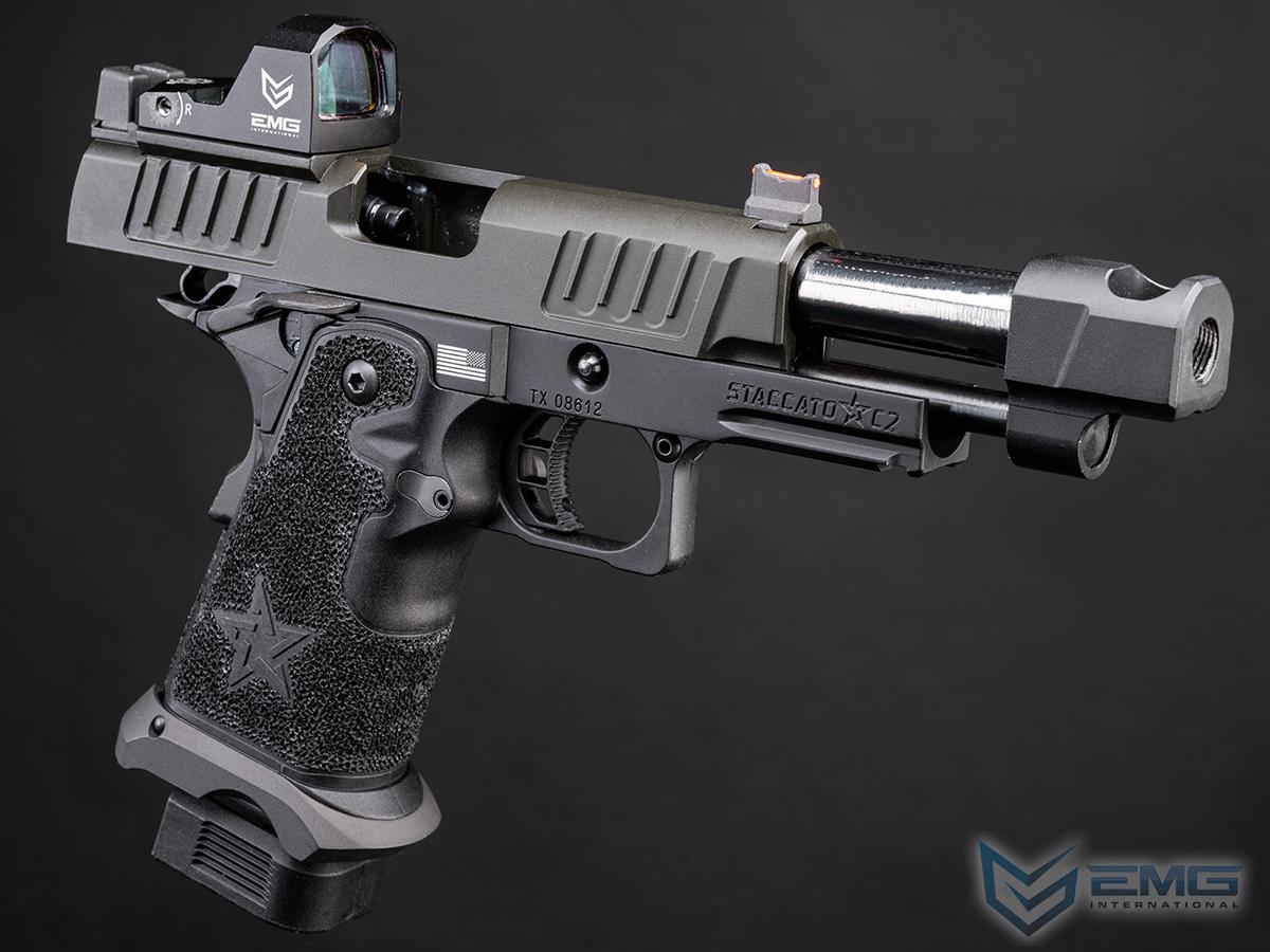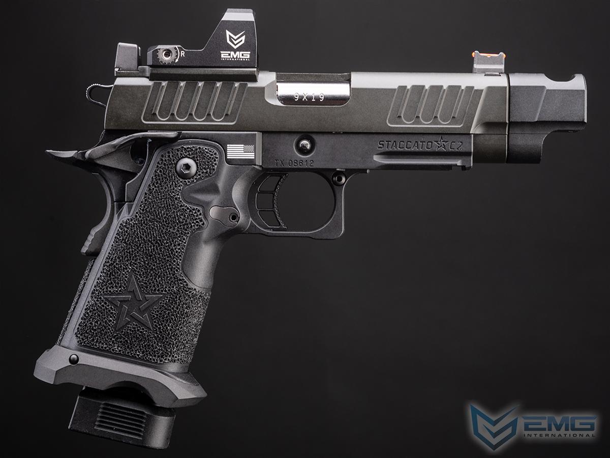 The real Staccato P COMP SOC is approved for duty by more than 1,300+ law enforcement agencies and carried by elite units like the Texas Rangers and the US Marshals Special Operations Group, as well as thousands of officers across the country. The P COMP SOC features a ingle-chamber compensator to reduce muzzle flip and felt recoil. The P is finely crafted with wide lightening cuts at the front and rear of the slide providing superior grip while racking it back, reduced recoil and improved cycling speed. The slide is RMR ready and comes with a RMR plate for the installation of your favorite reflex dot sight. Additionally, slide comes equipped with a fiber optic front sight and a tall rear sight that allowing continued functionality when a reflex dot sight is installed. The P metal frame is a robust and nicely weighted for a more realistic look and feel and comes with an under barrel accessory rail for your favorite lights or lasers. Preinstalled is a hand-stippled polymer grip which provides a comfortable and secure hold. Other features include a skeletonized trigger and textured trigger guard continuing to provide more stability while firing. The icing on this cake is the authentic licensed logos, patterns and roll marks of Staccato.