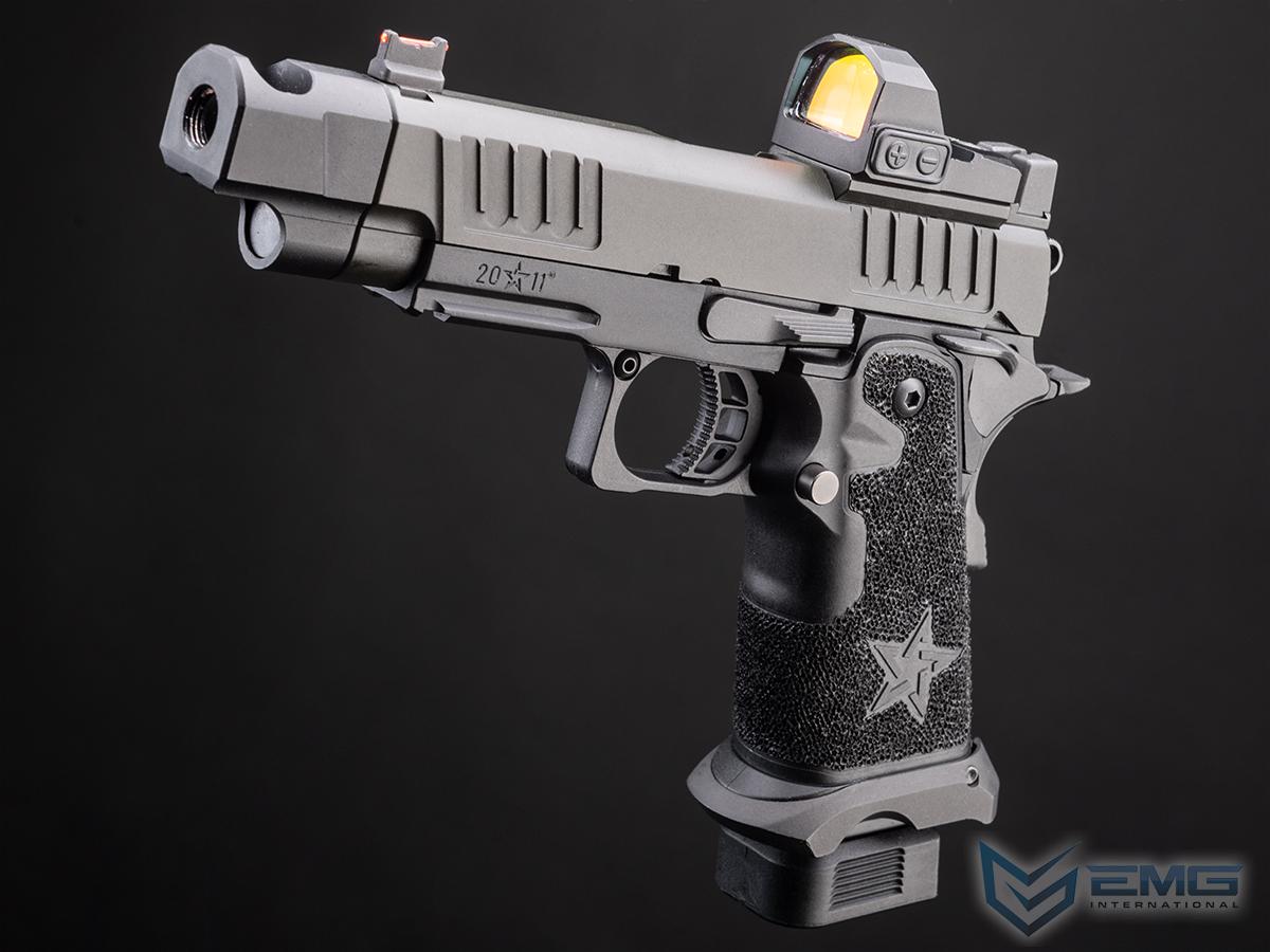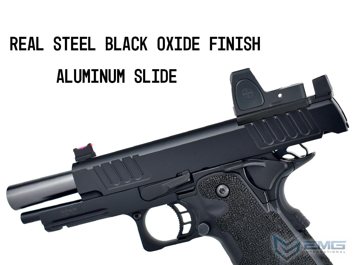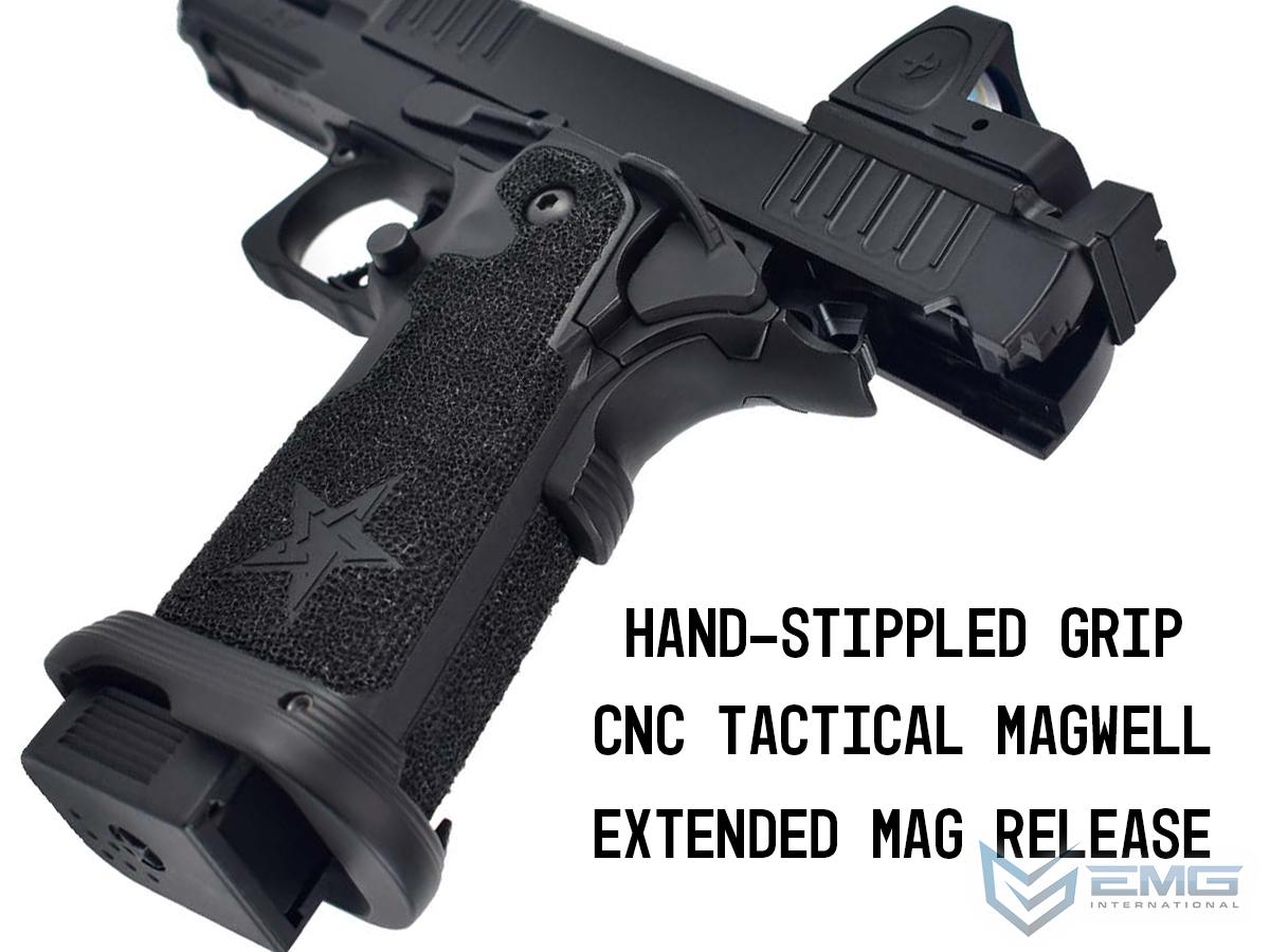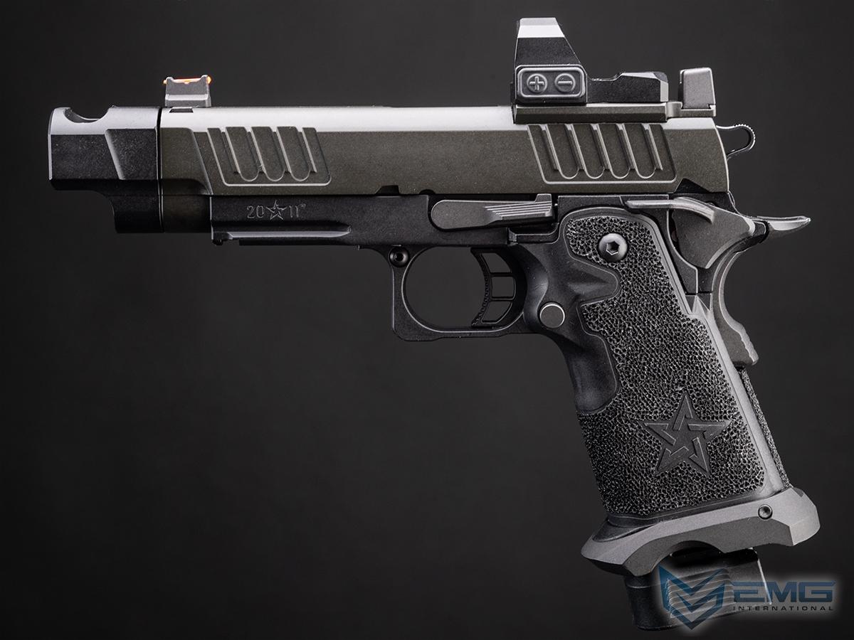 The real Staccato P COMP SOC is approved for duty by more than 1,300+ law enforcement agencies and carried by elite units like the Texas Rangers and the US Marshals Special Operations Group, as well as thousands of officers across the country. The P COMP SOC features a ingle-chamber compensator to reduce muzzle flip and felt recoil. The P is finely crafted with wide lightening cuts at the front and rear of the slide providing superior grip while racking it back, reduced recoil and improved cycling speed. The slide is RMR ready and comes with a RMR plate for the installation of your favorite reflex dot sight. Additionally, slide comes equipped with a fiber optic front sight and a tall rear sight that allowing continued functionality when a reflex dot sight is installed. The P metal frame is a robust and nicely weighted for a more realistic look and feel and comes with an under barrel accessory rail for your favorite lights or lasers. Preinstalled is a hand-stippled polymer grip which provides a comfortable and secure hold. Other features include a skeletonized trigger and textured trigger guard continuing to provide more stability while firing. The icing on this cake is the authentic licensed logos, patterns and roll marks of Staccato.