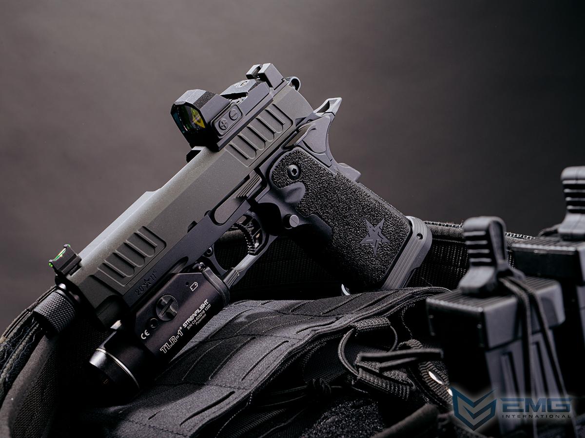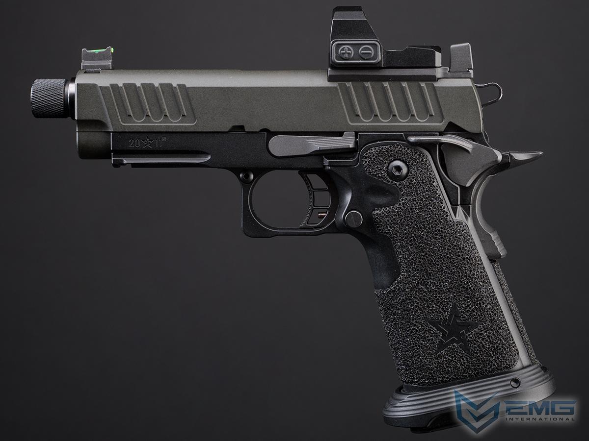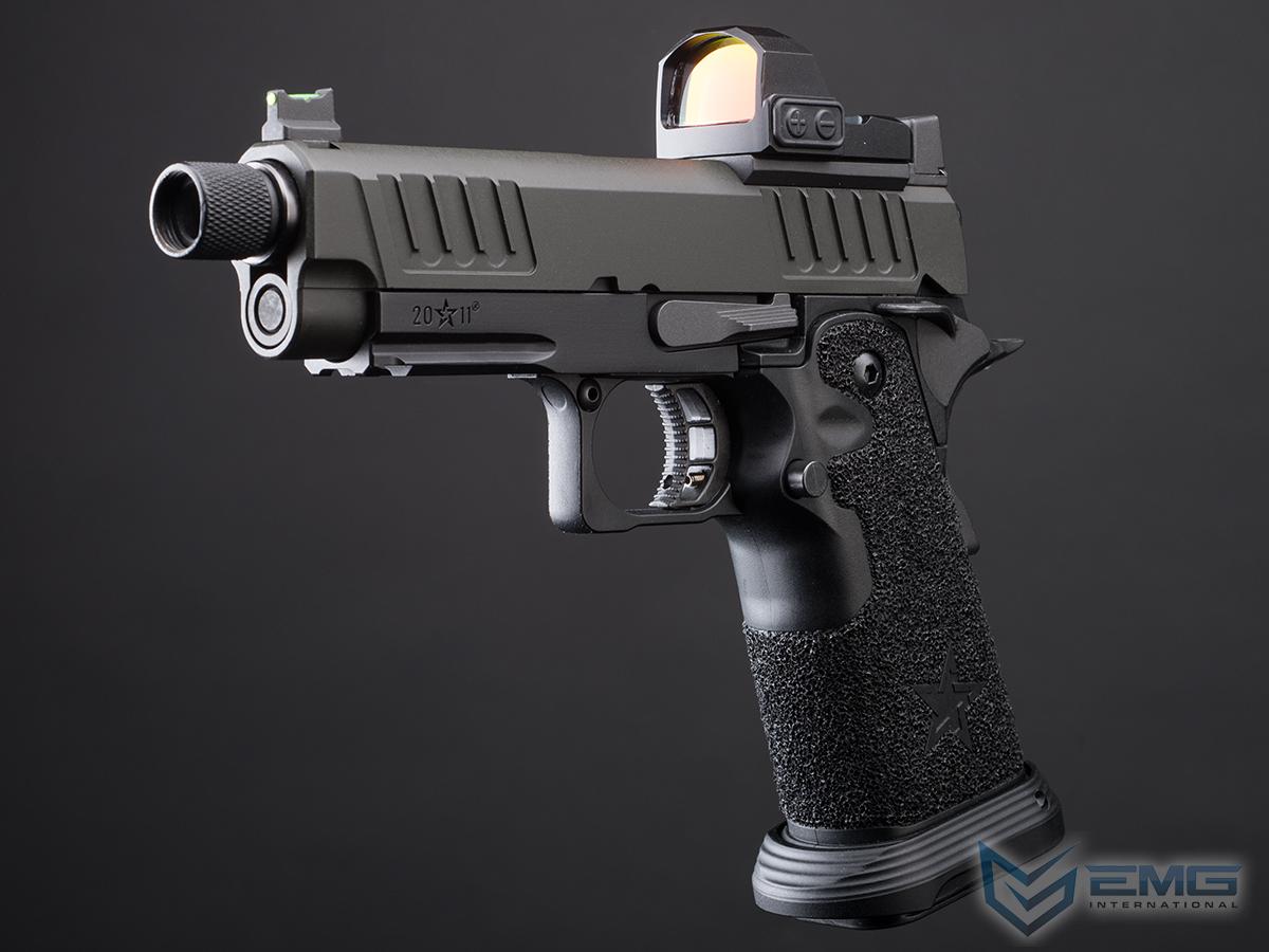 Magazine: 27+1 rounds. Works w/ EMG double stack 2011 GBB magazines