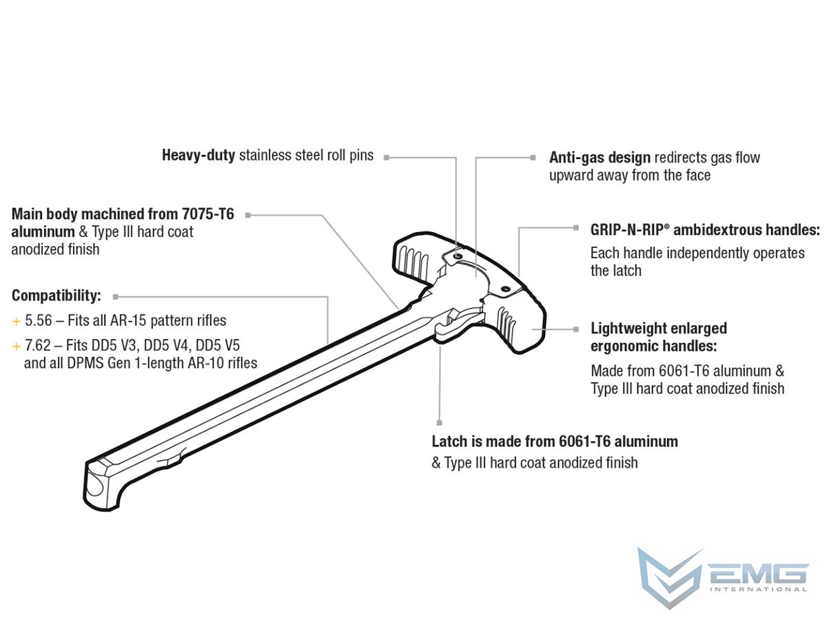 The Daniel Defense GRIP-N-RIP Charging Handle was designed and manufactured with the features and benefits to enhance every user's comfort and performance. The GRIP-N-RIP is engineered for suppressed fire, with anti-gas features that redirect gas flow upward and away from the face and away from the operator. Independently ambidextrous handles accommodate left- and right-handed shooters with each handle independently operating the latch. The 5.56 option fits all AR-15 pattern rifles, and the 7.62 option fits all DD5 GEN II (V3,V4,V5) firearms (not compatible with DD5 V1 or V2) and all DPMS Gen 1 length AR-10 rifles.