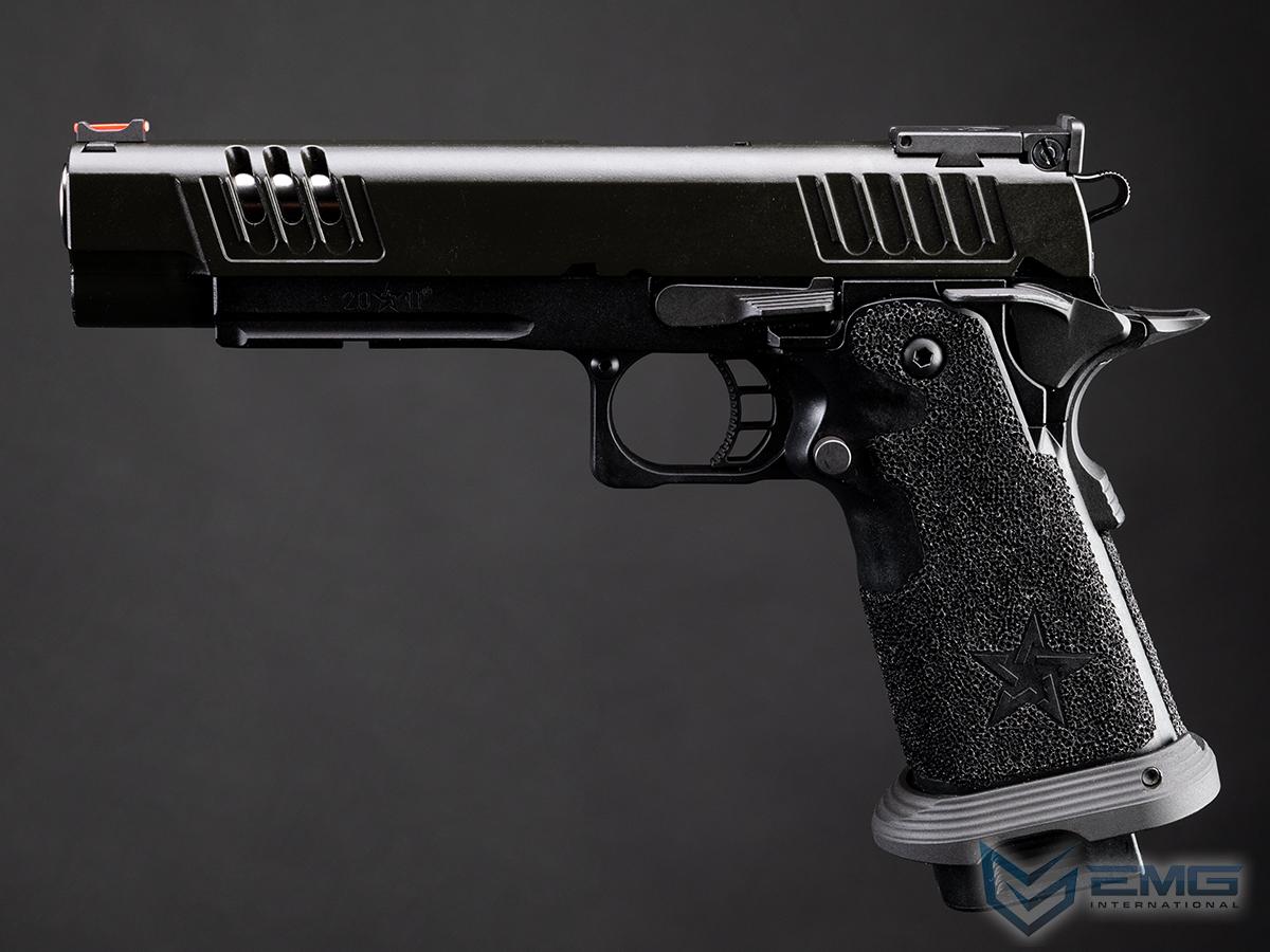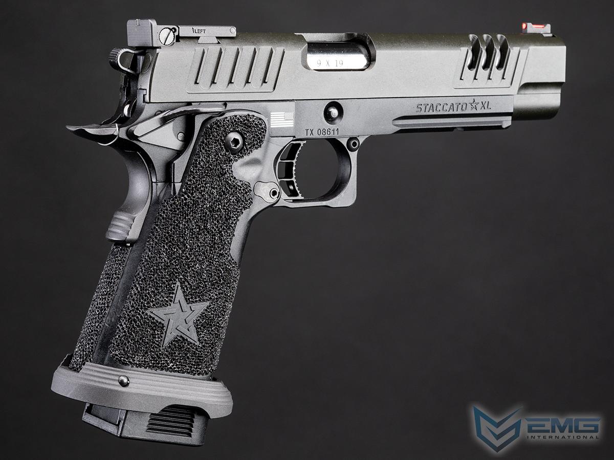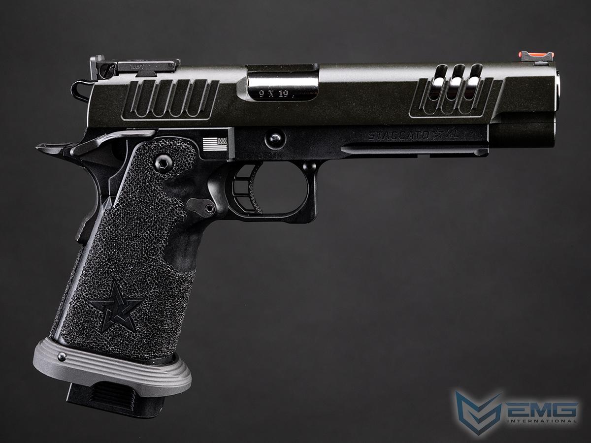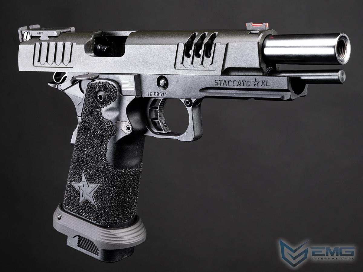 The Staccato XL is known as the ultimate competitor! With hundreds of USPSA, 3-Gun, and Tactical Games under its belt, the Staccato XL is the perfect match for range and competition shooters looking to shoot their personal best. The Staccato XL is popularized by it's weight, speed and accuracy. The XL is crafted with wide lightening cuts at the front and rear of the slide providing superior grip while racking it back, reduced recoil and improved cycling speed. Additionally, the front end of the slide is ported to enhance this further! Additionally, the slide comes equipped with a fiber optic front sight and a tall rear sight that allowing continued functionality when a reflex dot sight is installed. The XL metal frame is a robust and nicely weighted for a more realistic look and feel and comes with an under barrel accessory rail for your favorite lights or lasers. Preinstalled is a hand-stippled polymer grip which provides a comfortable and secure hold. Other features include a skeletonized trigger and textured trigger guard continuing to provide more stability while firing. The icing on this cake is the authentic licensed logos, patterns and roll marks of Staccato.