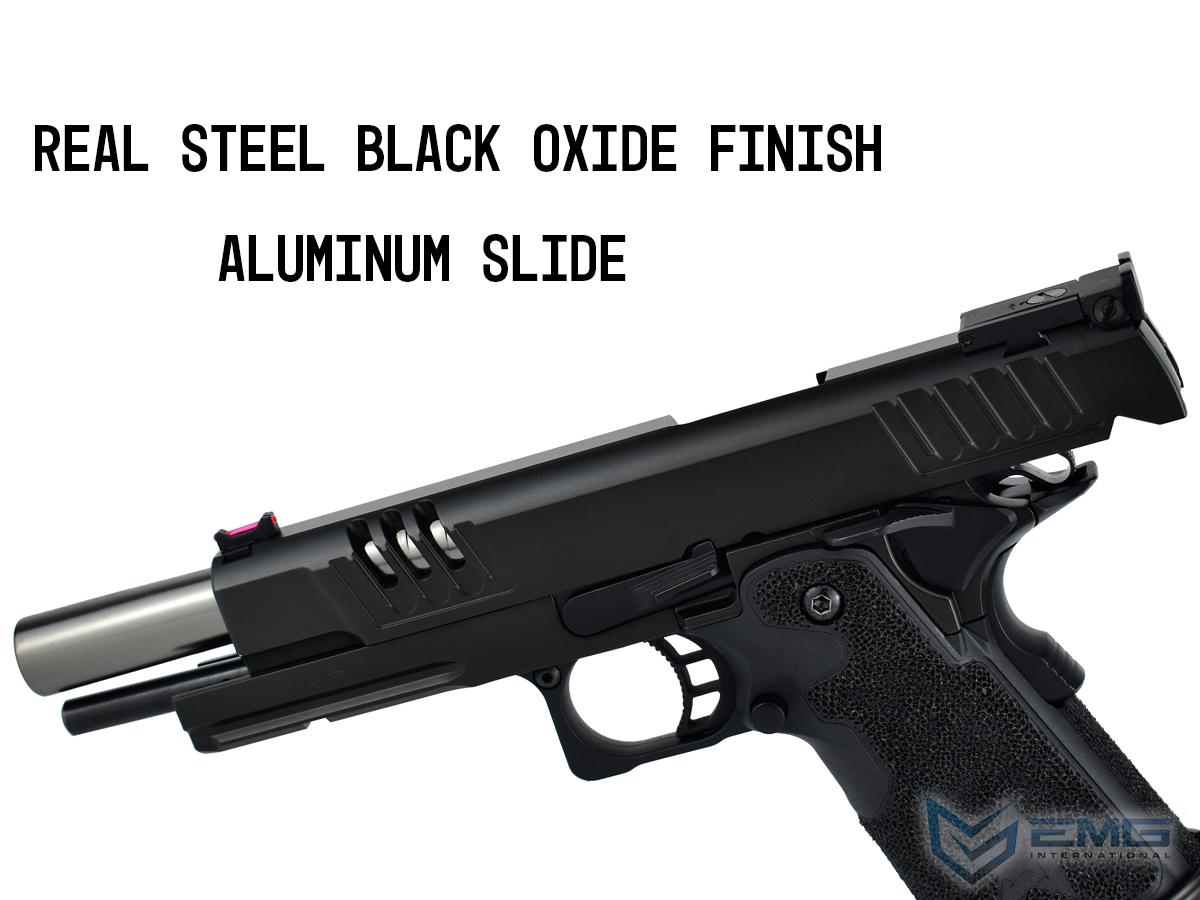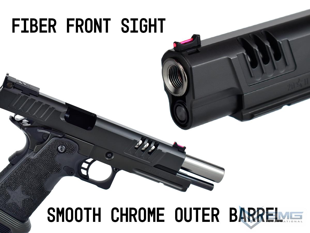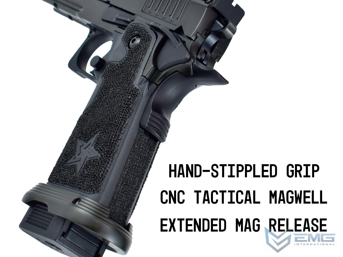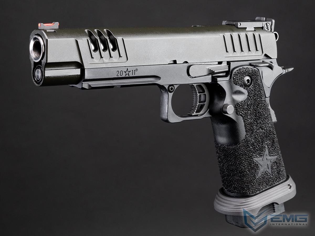 The Staccato XL is known as the ultimate competitor! With hundreds of USPSA, 3-Gun, and Tactical Games under its belt, the Staccato XL is the perfect match for range and competition shooters looking to shoot their personal best. The Staccato XL is popularized by it's weight, speed and accuracy. The XL is crafted with wide lightening cuts at the front and rear of the slide providing superior grip while racking it back, reduced recoil and improved cycling speed. Additionally, the front end of the slide is ported to enhance this further! Additionally, the slide comes equipped with a fiber optic front sight and a tall rear sight that allowing continued functionality when a reflex dot sight is installed. The XL metal frame is a robust and nicely weighted for a more realistic look and feel and comes with an under barrel accessory rail for your favorite lights or lasers. Preinstalled is a hand-stippled polymer grip which provides a comfortable and secure hold. Other features include a skeletonized trigger and textured trigger guard continuing to provide more stability while firing. The icing on this cake is the authentic licensed logos, patterns and roll marks of Staccato.
