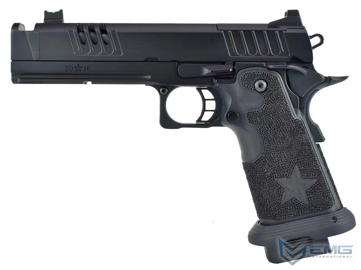 The Staccato XC is known as the unfair advantage! From elite shooters to everyday range shooters, the Staccato XC delivers incredibly flat and fast shooting. The Staccato XC is popularized by the ease for both competition and novice shooters to hit their targets. The XC is crafted with wide lightening cuts at the front and rear of the slide providing superior grip while racking it back, reduced recoil and improved cycling speed. Additionally, the front end of the slide is ported to enhance this further! The slide is RMR ready and comes with an RMR plate for the installation of your favorite reflex dot sight. Additionally, the slide comes equipped with a tall rear sight that allowing continued functionality when a reflex dot sight is installed. The front end comes with a built in static fiber optic front sight and an aggressive single port compensator. The XC metal frame is a robust and nicely weighted for a more realistic look and feel and comes with an under barrel accessory rail for your favorite lights or lasers. Preinstalled is a hand-stippled polymer grip which provides a comfortable and secure hold. Other features include a skeletonized trigger and textured trigger guard continuing to provide more stability while firing. The icing on this cake is the authentic licensed logos, patterns and roll marks of Staccato.