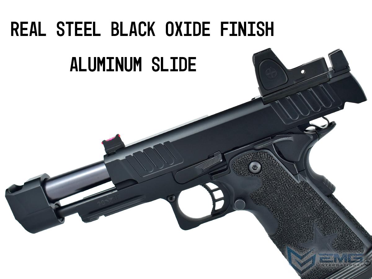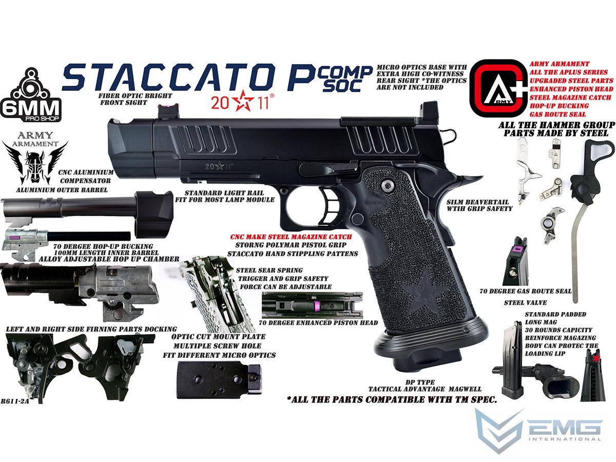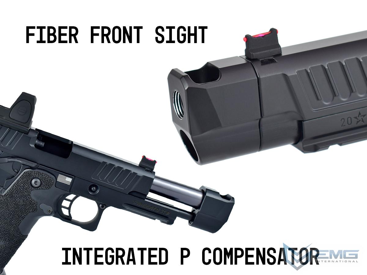 The real Staccato P COMP SOC is approved for duty by more than 1,300+ law enforcement agencies and carried by elite units like the Texas Rangers and the US Marshals Special Operations Group, as well as thousands of officers across the country. The P COMP SOC features a ingle-chamber compensator to reduce muzzle flip and felt recoil. The P is finely crafted with wide lightening cuts at the front and rear of the slide providing superior grip while racking it back, reduced recoil and improved cycling speed. The slide is RMR ready and comes with a RMR plate for the installation of your favorite reflex dot sight. Additionally, slide comes equipped with a fiber optic front sight and a tall rear sight that allowing continued functionality when a reflex dot sight is installed. The P metal frame is a robust and nicely weighted for a more realistic look and feel and comes with an under barrel accessory rail for your favorite lights or lasers. Preinstalled is a hand-stippled polymer grip which provides a comfortable and secure hold. Other features include a skeletonized trigger and textured trigger guard continuing to provide more stability while firing. The icing on this cake is the authentic licensed logos, patterns and roll marks of Staccato.