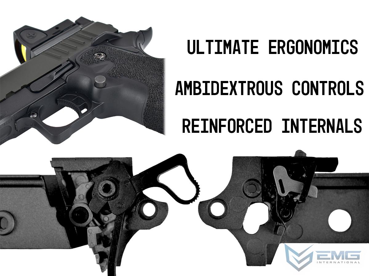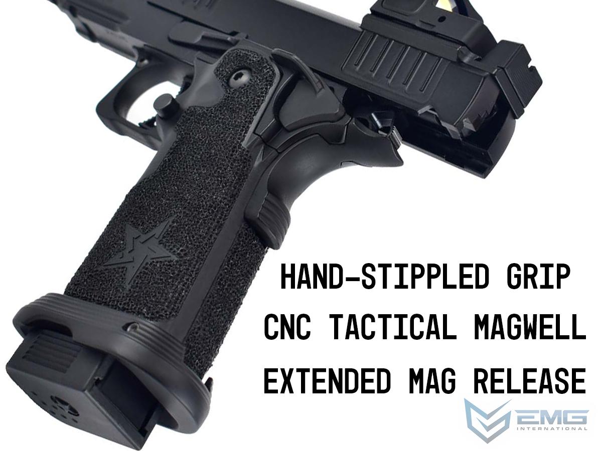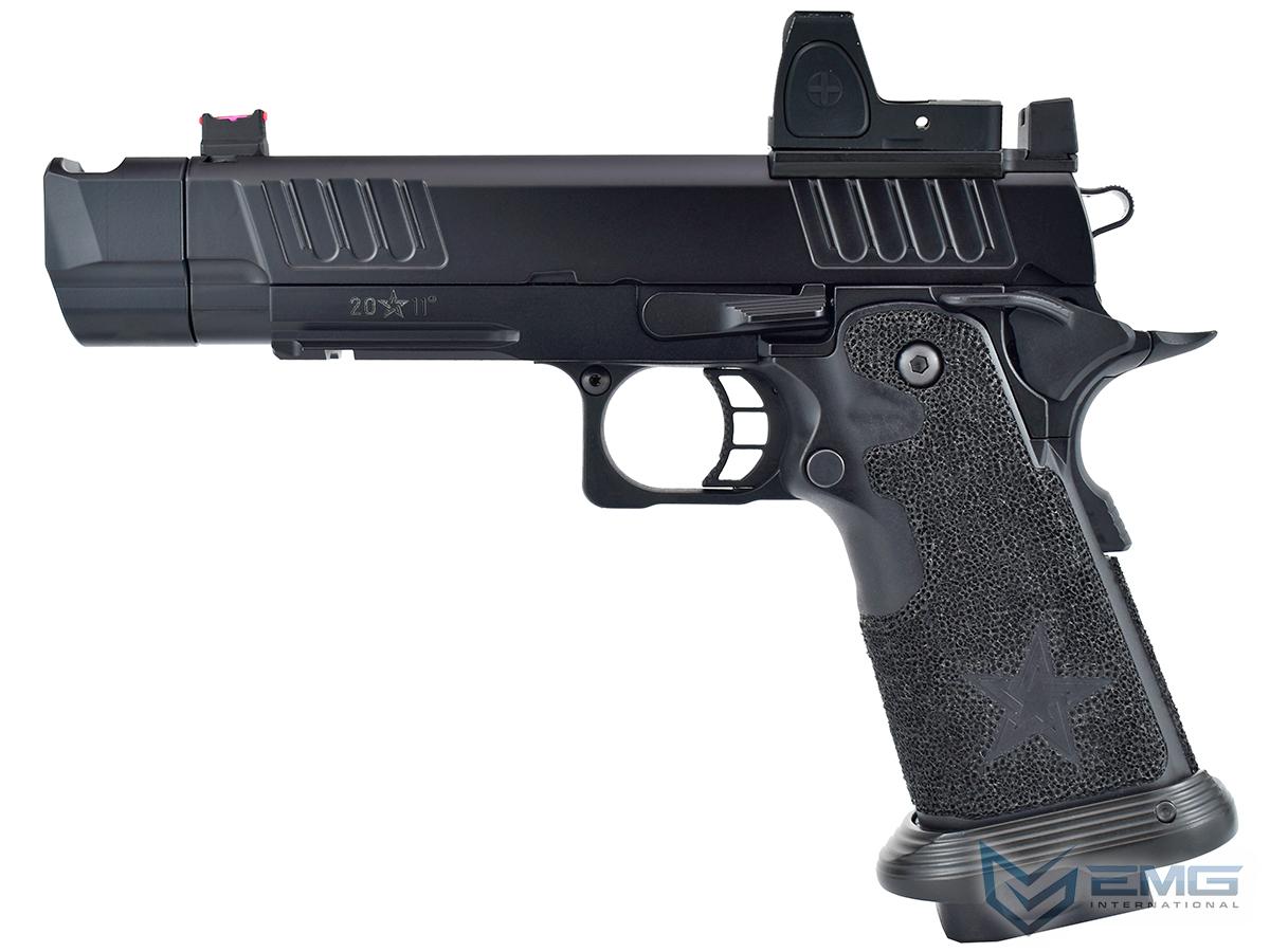 The real Staccato P COMP SOC is approved for duty by more than 1,300+ law enforcement agencies and carried by elite units like the Texas Rangers and the US Marshals Special Operations Group, as well as thousands of officers across the country. The P COMP SOC features a ingle-chamber compensator to reduce muzzle flip and felt recoil. The P is finely crafted with wide lightening cuts at the front and rear of the slide providing superior grip while racking it back, reduced recoil and improved cycling speed. The slide is RMR ready and comes with a RMR plate for the installation of your favorite reflex dot sight. Additionally, slide comes equipped with a fiber optic front sight and a tall rear sight that allowing continued functionality when a reflex dot sight is installed. The P metal frame is a robust and nicely weighted for a more realistic look and feel and comes with an under barrel accessory rail for your favorite lights or lasers. Preinstalled is a hand-stippled polymer grip which provides a comfortable and secure hold. Other features include a skeletonized trigger and textured trigger guard continuing to provide more stability while firing. The icing on this cake is the authentic licensed logos, patterns and roll marks of Staccato.