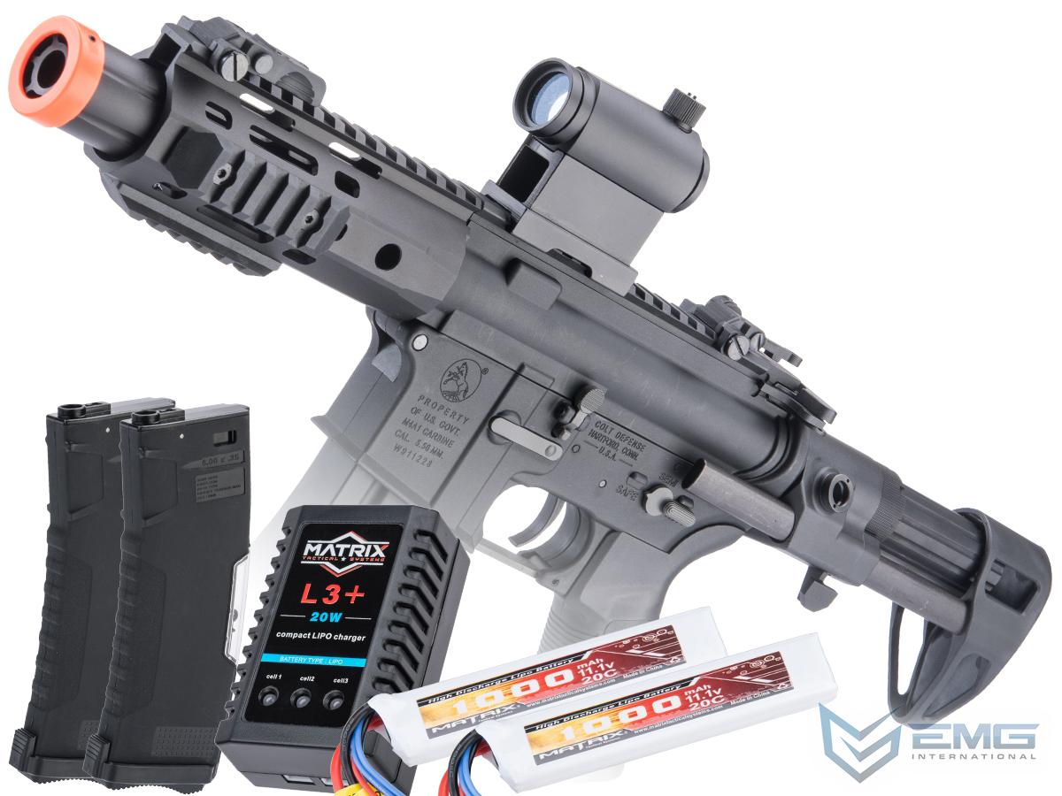 Package Includes: Gun, High Cap Magazine, 2x Spare BAMF Gen2 Mid-Cap Magazines, T1 style Red Dot Optic, 2x Matrix 11.1v LiPo Batteries, LiPo Balancing Smart Charger, LiPo Safe Charging Bag, Airsoft Safety Sack