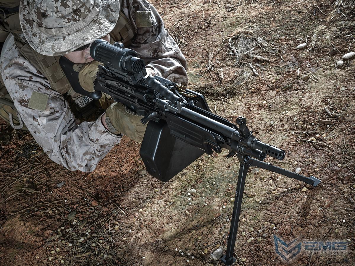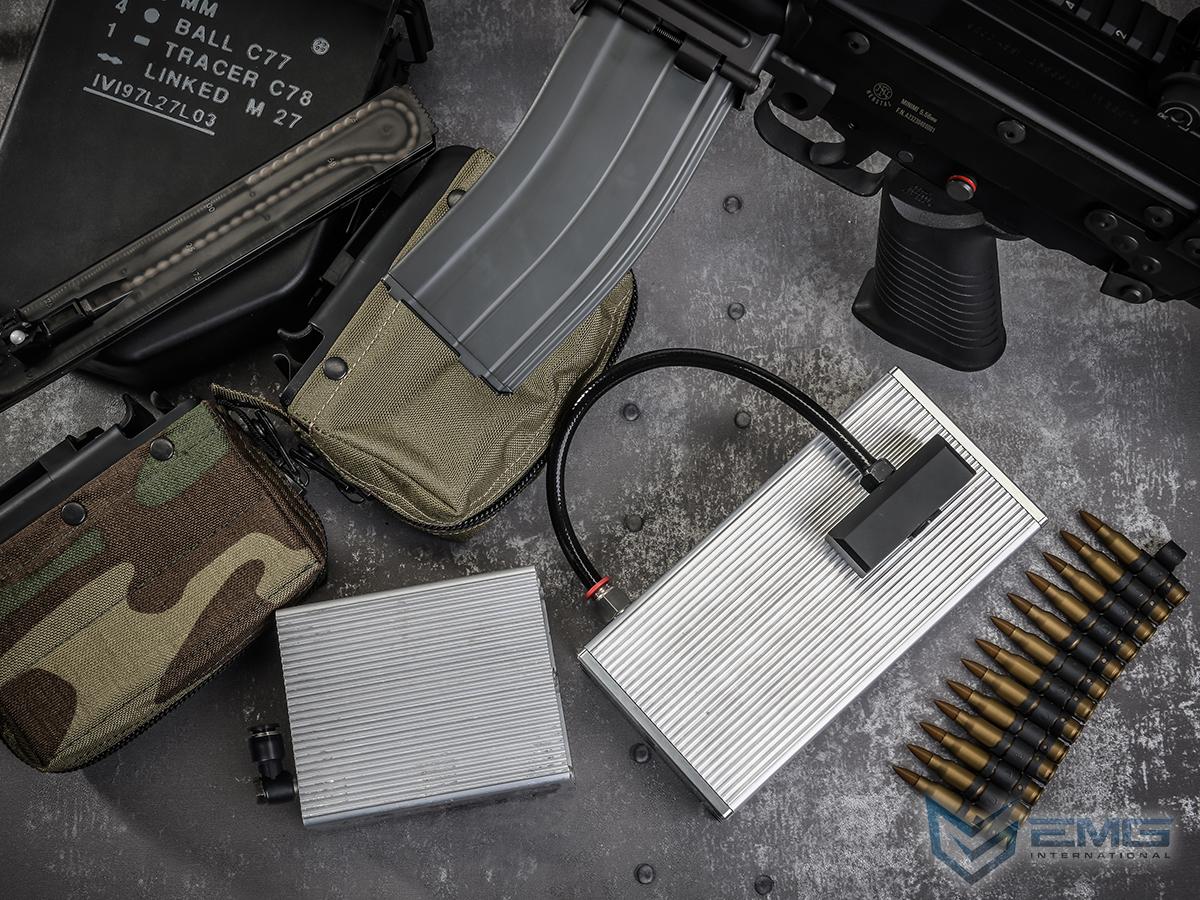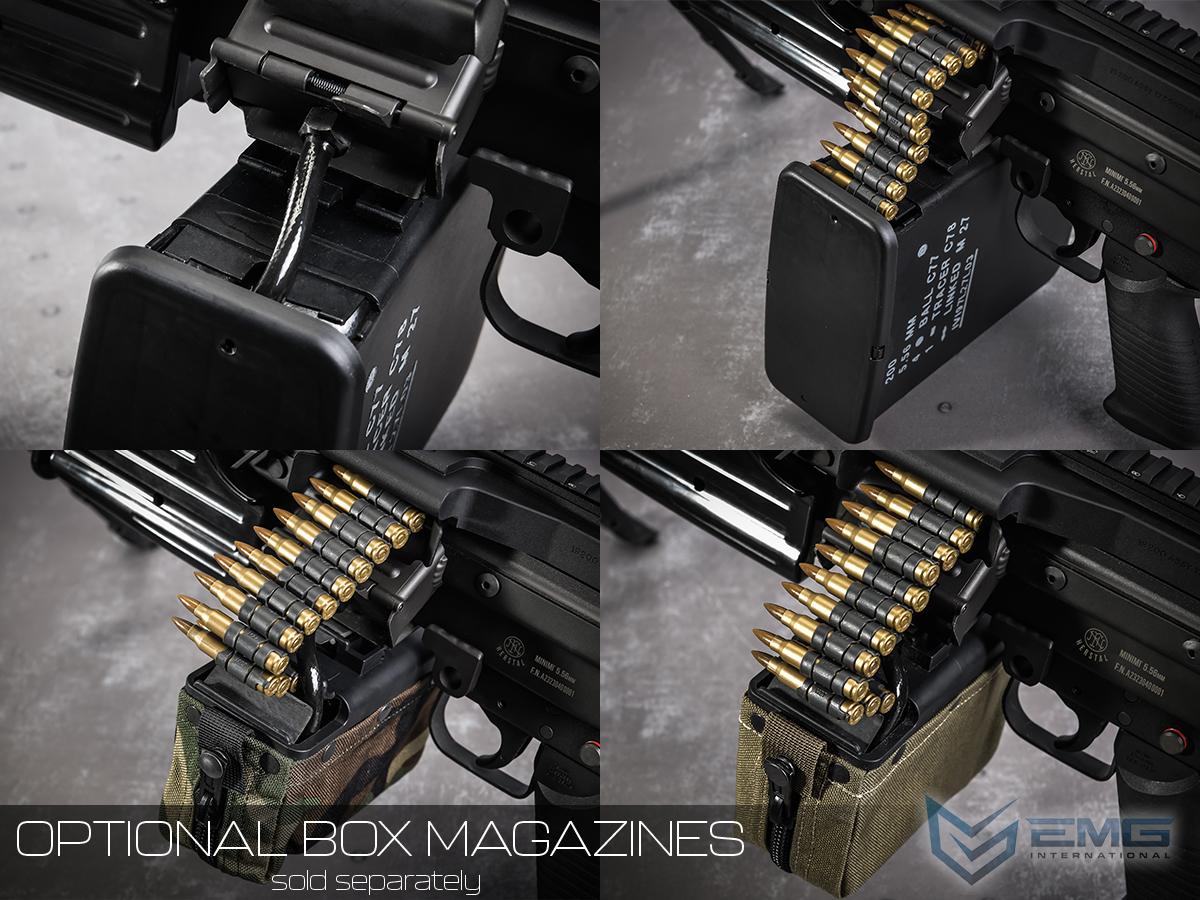 - Choose between the massive box magazine reservoir (sold separately) or the lighter-weight, smaller STANAG-style magazine