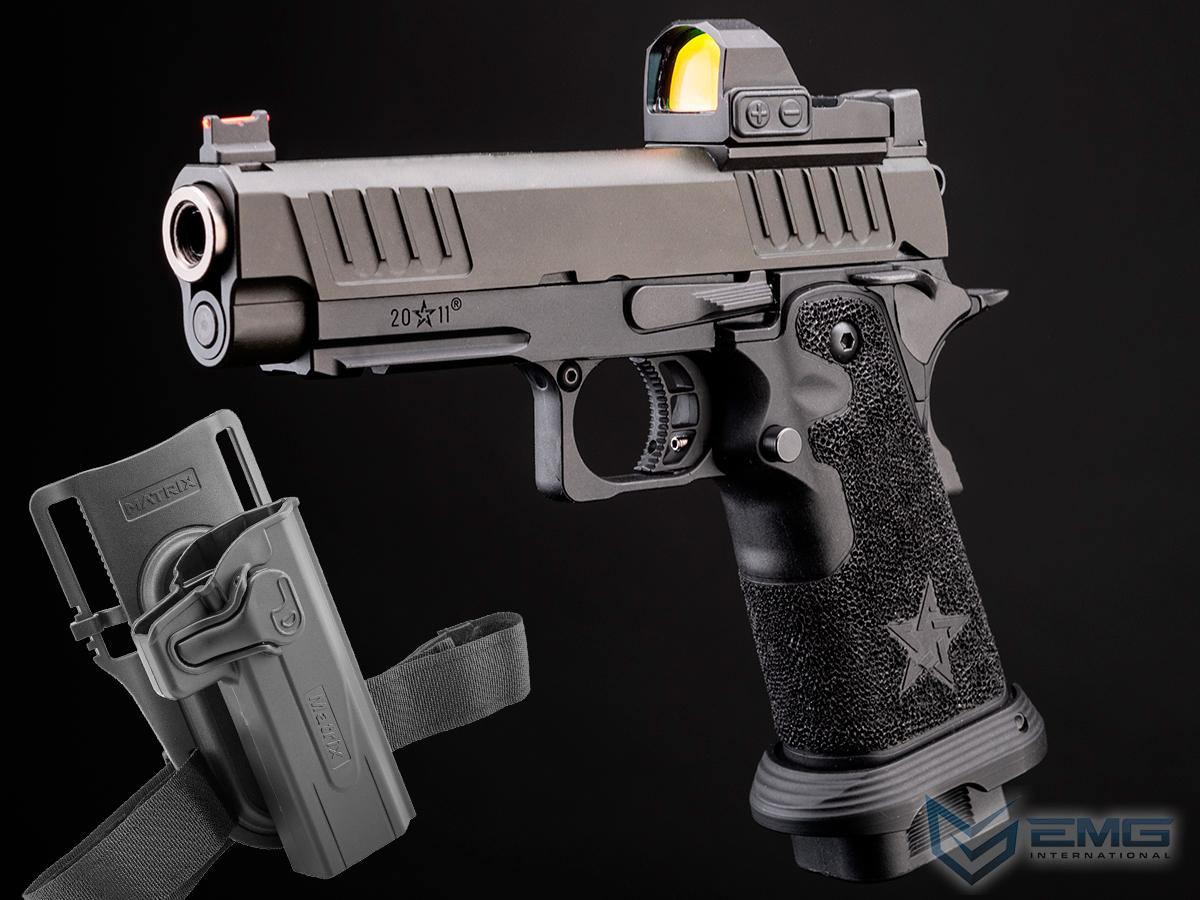 Magazine: 27+1 rounds. Works w/ EMG double stack 2011 GBB magazines