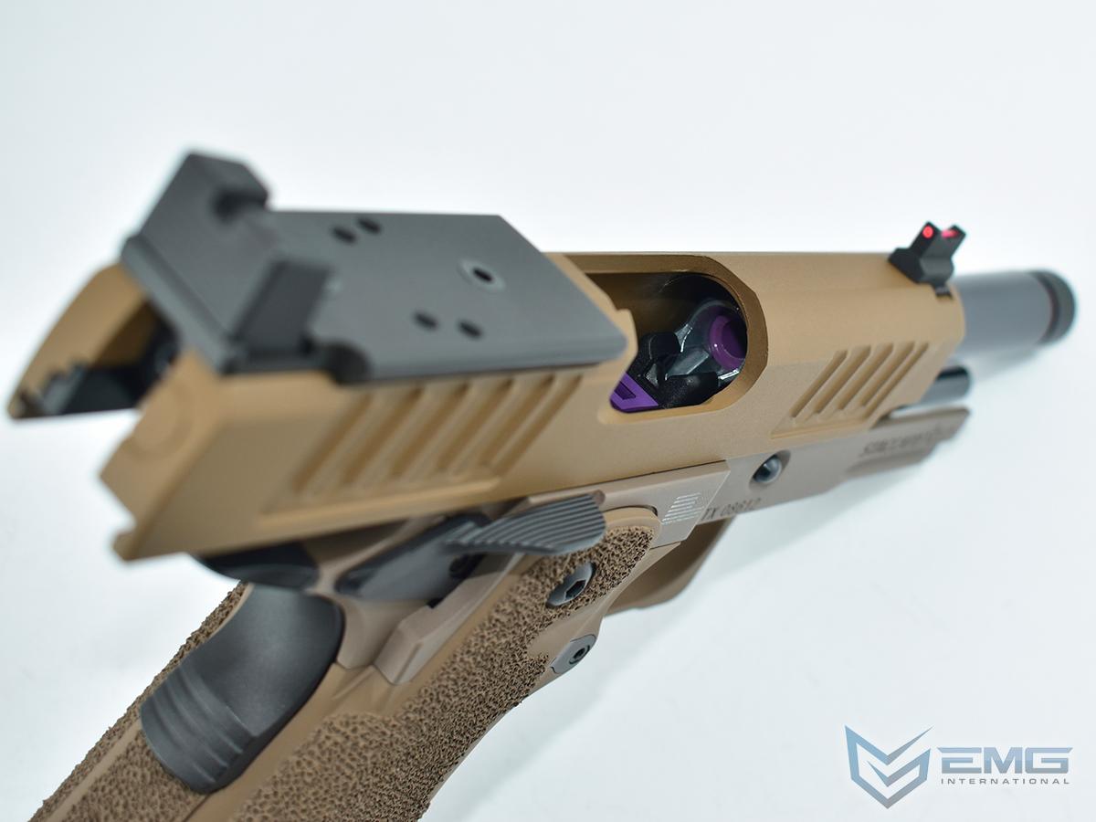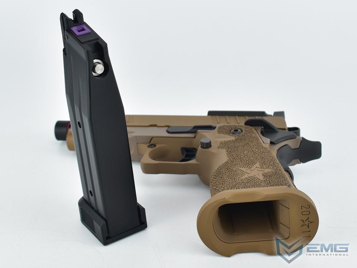 Magazine: 27+1 rounds. Works w/ EMG double stack 2011 GBB magazines