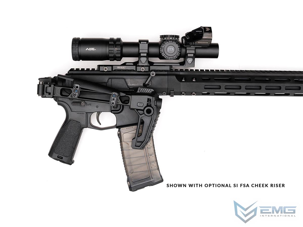 The Strike Dual Folding Adapter is the first-in-market patented system that has an intuitive unfolding system for a Picatinny interface. The Strike Dual Folding Adapter folds left or right anytime without flipping or reconfiguring the hinge. At any moment, the user can fold to the desired left or right side. When moved into the folded position, there is a positive lock so the Strike Dual Folding Adapter remains folded. A simple pull up on the bar near the hinge and back for quick deployment when folded. A 3-degree down tilt angle is added to help prevent interference with the weapons ejection port when folded to the right side. The Strike Dual Folding Adapter mounts directly to a 1913 Picatinny interface with two (x2) built-in locking lugs for a secure attachment. For the stock rear piece, included is a rear rubber anti-slip buttpad to create the best possible shoulder weld for rifle or registered Short-Barrel Rifle (SBR) setups. An ambidextrous QD sling mounting points for the stock. The Strike Dual Folding Adapter is constructed with a steel hinge and 6061-T6 Aluminum base, adapter & strut. Get a unique modular system with interchangeable (sold separately) parts like optional cheek riser (to be only used legally with stock setup), strut lengths and other accessories. Use with almost any 1913 Picatinny rear end like the Strike AR Picatinny Stock Adapter or many factory OEM weapons with a Picatinny rail section in place of the traditional AR buffer tube threads. The Strike Dual Folding Adapter is a one of a kind adapter that gives you more options than anything on the market for those who want a truly modular folder that is under 10 ounces.