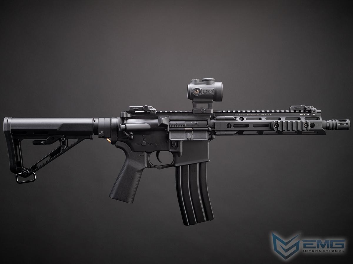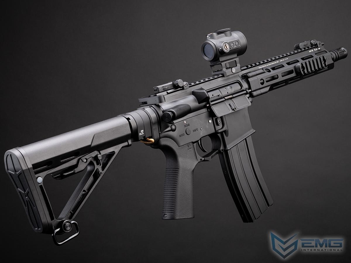 Built to replicate as close as possible to the real steel counterpart, the receiver and MFR handguard are fully licensed with authentic roll marks, engraving and markings. The aluminum MFR 9" handguard comes with M-LOK slots throughout for your favorite accessories like lights, lasers, PEQ boxes, grips and more! Additionally it includes 3 quick detach sling points on each side of the handguard. From receiver to the tip of the handguard is an uninterrupted top Picatinny rail for optics and comes equipped with APS hawk backup sights. Lastly, the rifle comes with a fully adjustable APS RS3 minimalistic folding stock and EMG Alpha 19 ergonomic pistol grip to improve mobility and handling.