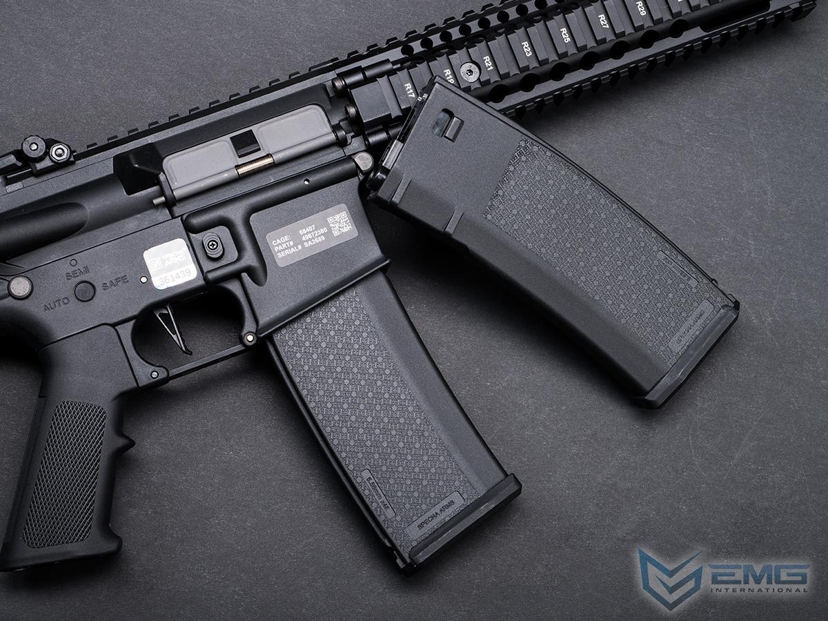 This magazine is known for its compact, durable construction and smooth design. Notably, it features the distinctive texture with Specna Arms logos. Made from durable polymer, its unique construction ensures compatibility with most replicas on the market and is ideally suited for various tactical setups. The S-MAG⢠enables seamless feeding of BBs even at high rates of fire.