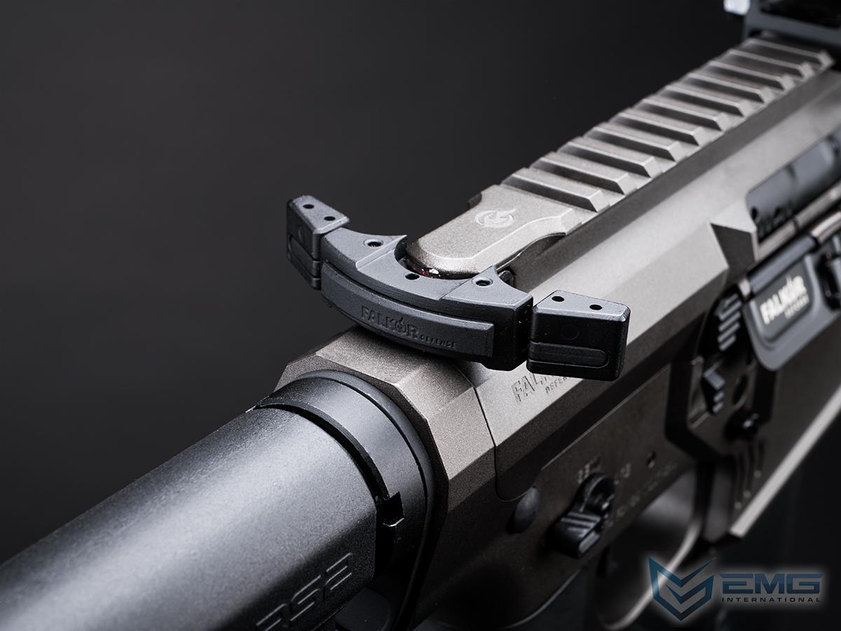 The Falkor Blitz SBR from EMG starts with a metal upper and lower receiver unlike any other AEG on the market. With extensive tactical styling, this receiver is bar none. In addition to the unique styling of the Falkor, nearly every piece is ambidextrous including the magazine catch, bolt release, short throw fire selector and a Falkor Mach 15 Ambi-charging handle is also present to complete the high end look of this rifle. A super dynamic 3-Gun style straight trigger gives the operator a unique and fast trigger manipulation. The flared magwell grip features ridges on the front for operators who prefer a magwell style grip on their rifle. It should also be noted that the upper receiver sports a unique style that will set the look apart from every other M4 variant on the market. Moving onward you will find a flush top rail leading into FALKOR Fatty Free-Float 11.5" M-LOK⢠Handguard, allowing the end user to install any M-LOK compatible accessories and rail segments. The furniture of the Falkor Blitz is also optimized for performance, modularity and comfort. A textured, slim profile motor grip paired with the minimalist stock not only completes the look of the rifle, but makes it an extremely comfortable piece to shoulder and field.