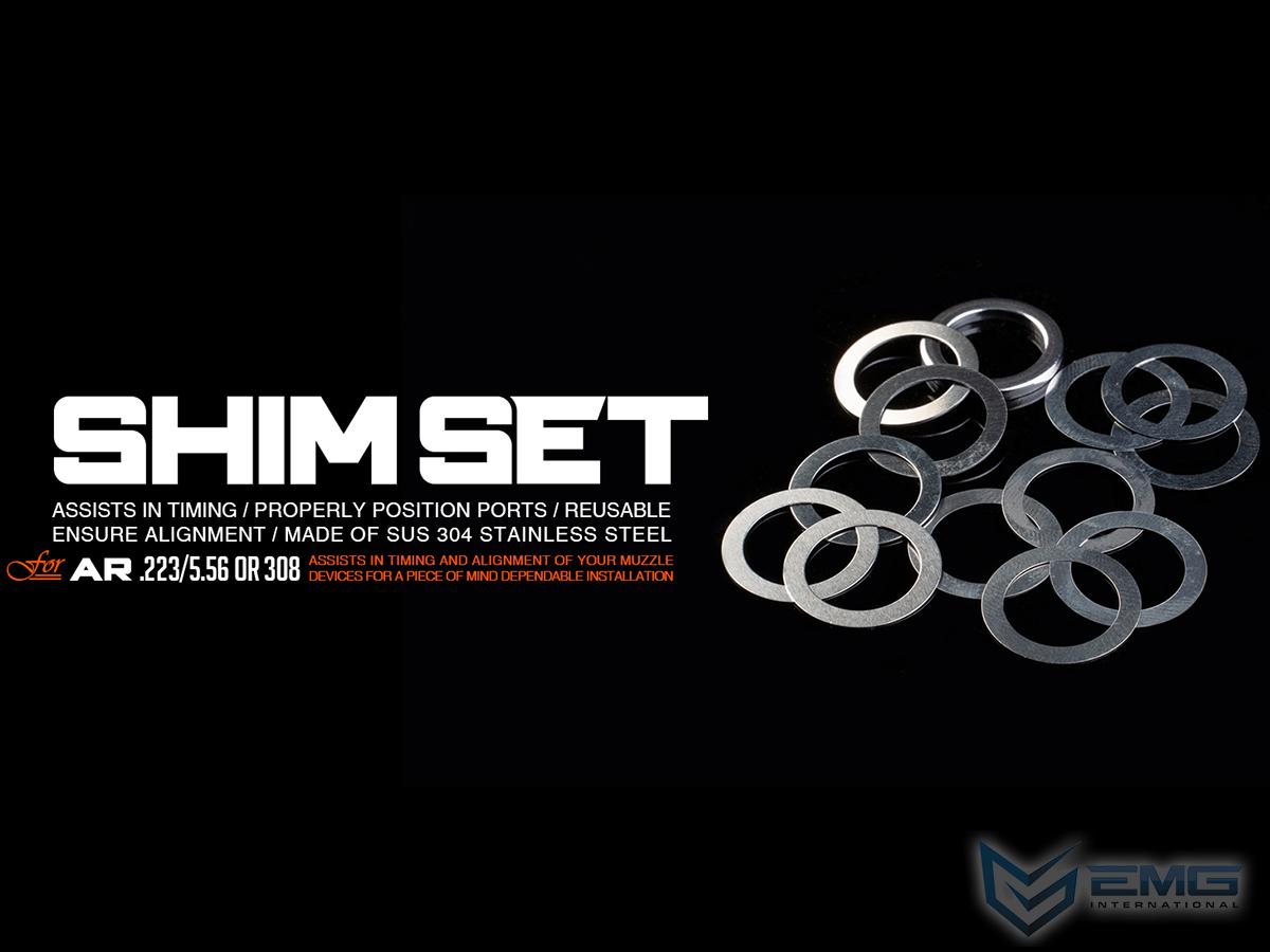 The Strike Industries AR Shim Set for .223/5.56 or .308 assists in timing and alignment of your muzzle devices for a piece of mind dependable installation. Crush washers are usually a one-time use washer designed to deform and do not gaurantee alignment. Shim washers are flat, consistant and should be used whenever bore alignment is critical in appplications such as silencer mounts or to ensure your muzzle device ports are corectly positioned. Available in both 1/2"-28 TPI (.223/5.56) or 5/8"-24 TPI (.308) sizes, the Strike Industries AR Shim Set for .223/5.56 or .308 are solid one-piece shims made in various precision thicknesses for just about any application.