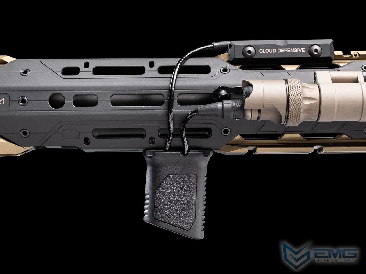 The Strike Industries Angled Vertical Grip with Cable Management (Picatinny) is engineered like no other grip on the market. The grip angle sits on the handguard at 86 degrees. The patent pending SI Cable Management System® (CMS) function enables you to organize and store excess wire from your weapon light or any other cabled accessories. Instead of tucking wire anywhere you can and using cable ties or tape to hold it down, the SI CMS will offer you a place to route and/or contain loose wire inside the grip cavity. The cuts at the top middle of the grip allow for easier pressure switch attachment. On both the Short and Long version there has an added built-in stability feature when you place the L-shaped bottom onto a table edge/corner or as a barricade stop, giving you another way to get back on target faster downrange. The Short version is a low-profile form helps to minimize snags. The forward angle provides more of a natural wrist angle and increased rigidity of forearm. Designed with textured palm and finger areas with flat sides for positive handling and easier manipulation of the firearm. Made from durable and lightweight polymer compatible with M-LOK rails, the Strike Industries Angled Vertical Grip with Cable Management gives the shooter control while handling or firing the weapon, added stability with table/edge corner or as a barricade stop and an innovative way to ensure total cable management. No messy wires.