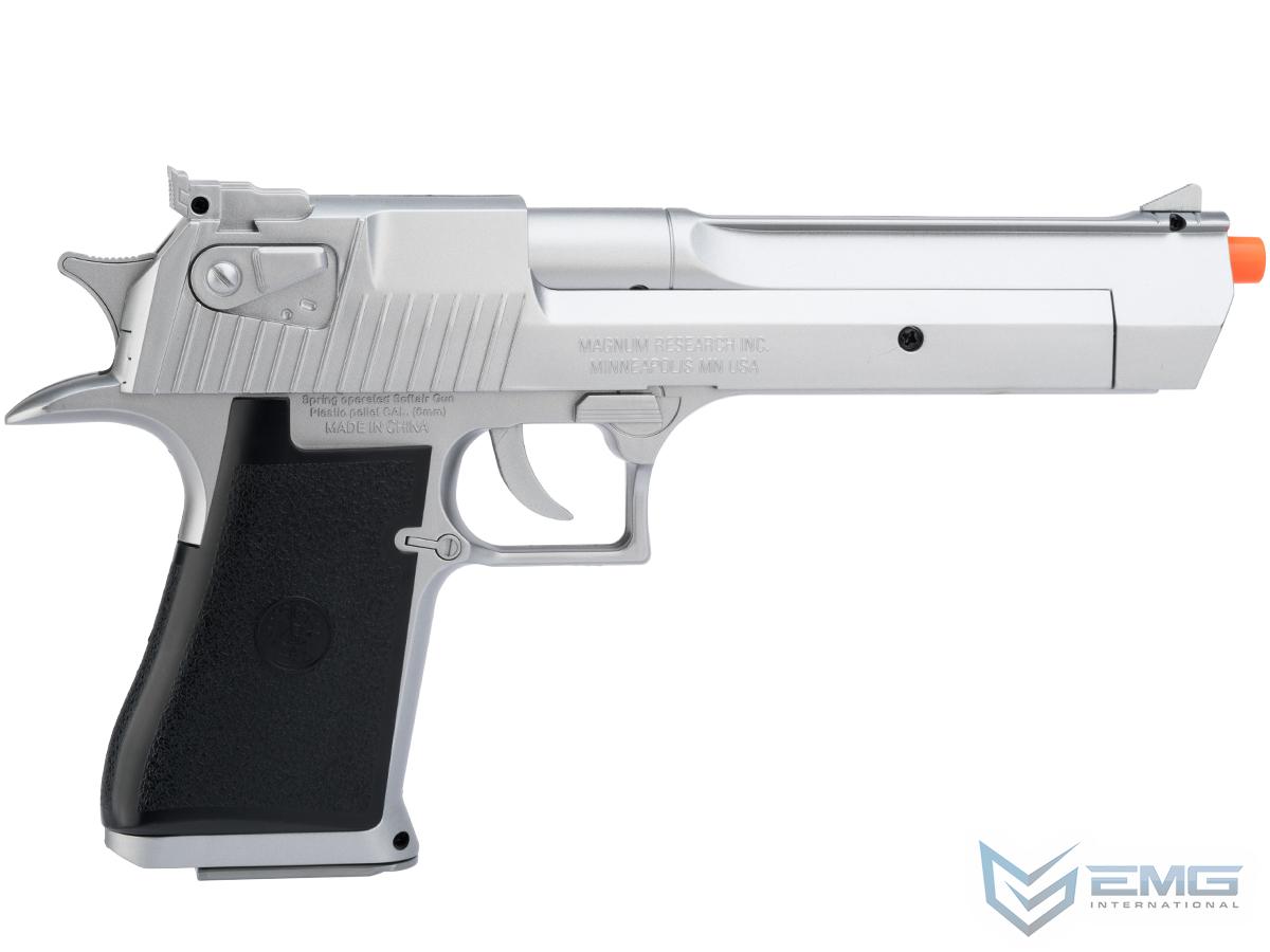 The Desert Eagle Magnum is a faithful replica of the world famous Desert Eagle large caliber hand gun. This Airsoft pistol features detachable magazine, spring loaded power, on frame safety and serrated slide.