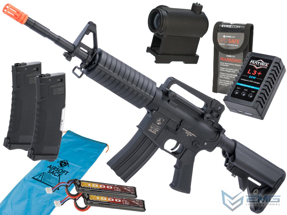 Package Includes: Gun, Magazine, 2x Spare BAMF Gen2 Mid-Cap Magazines, T1 style Red Dot Optic, 2x Matrix 11.1v LiPo Batteries, LiPo Balancing Smart Charger, LiPo Safe Charging Bag, Airsoft Safety Sack