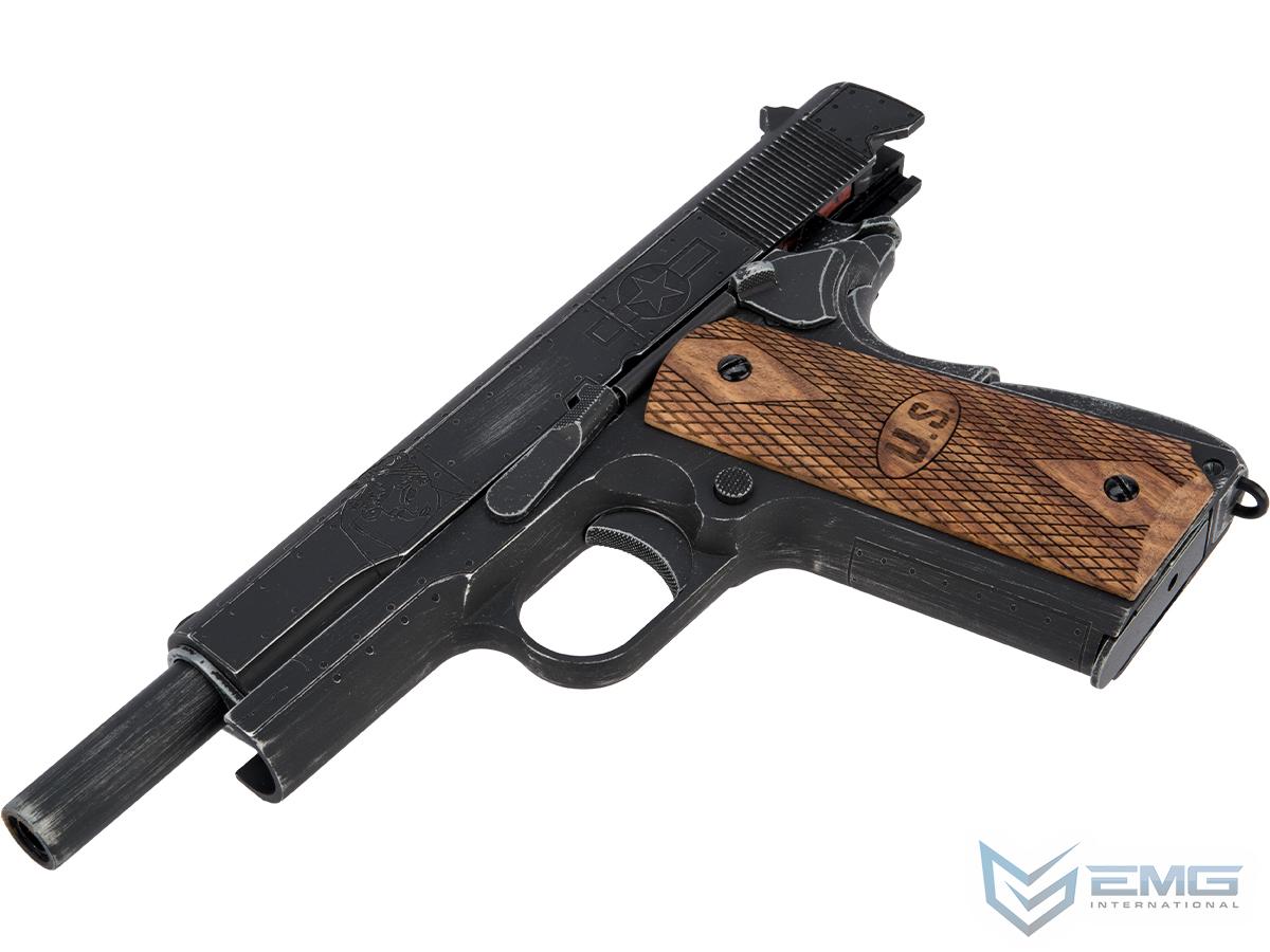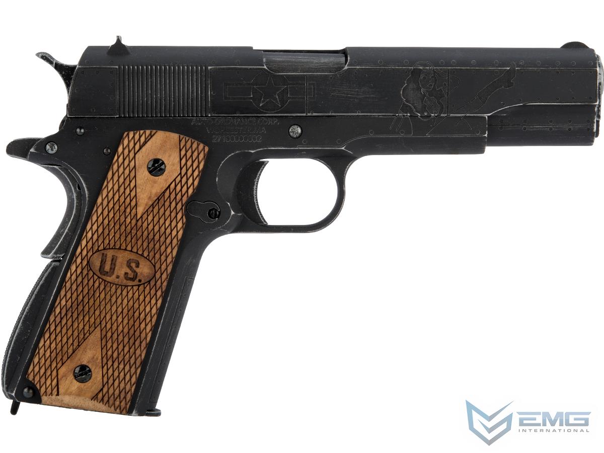 In collaboration with Auto-Ordnance, Cybergun accurately recreates this masterpiece of a firearm in Airsoft form. The fighter-like details are laser cut deep into the slide and frame itself to make them really stand out over standard surface engraving. Each pistol is weathered to to give the gun a nice combat hardened, worn-in appearance that really give the gun character. Finishing off the fine level of detail are the beautiful real wood grips which are precision laser cut with diamond texturing and U.S. insignia.