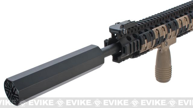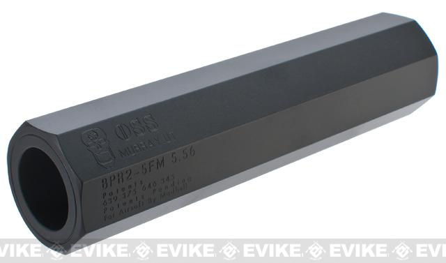 Operators Suppressor Systems (OSS) is an industry innovator with their Back Pressure Regulator (BPR). Unlike traditional suppressors the real steel BPR limits negative effects of pressure to the piston / bolt system and in essence creates a more controllable, more reliable platform.The Airsoft equivalent of the BPR2 by Madbull gives a unique, extremely aggressive look to your rifle. If you're tired of the "typical" mock suppressor / barrel extension, slap one of these bad boys onto your gun. You can be sure your rifle will be turning some heads. The Madbull OSS is constructed from CNC milled aluminum that has been coated with a matte black finish. Authentic OSS trademarks have been stamped into the body of the barrel extension giving it a truly realistic look.