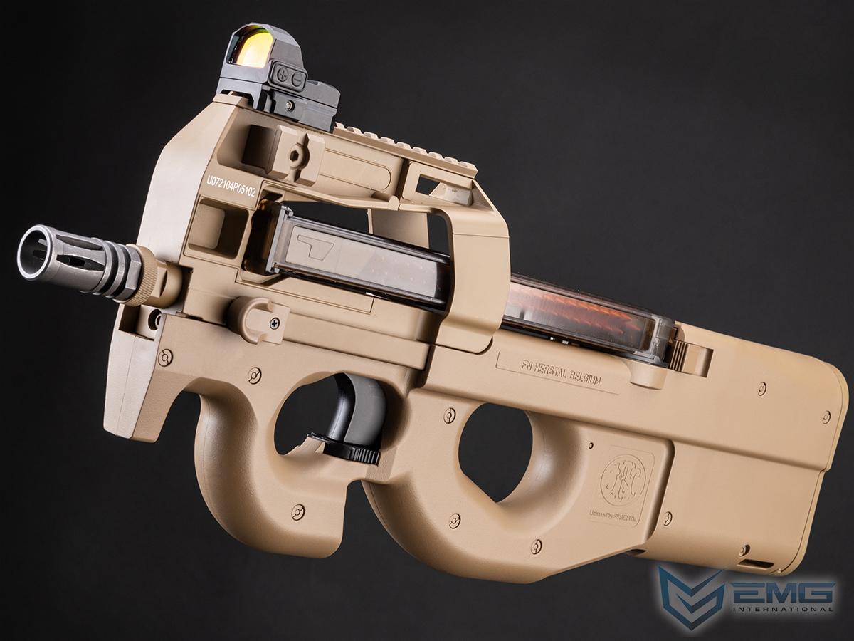 The FN® Licensed Airsoft P90 accurately replicates the great handling and ergonomics of the real P90 with its fully ambidextrous control layout and comfortable grip. Just like the actual P90, the FN® Licensed Airsoft replica consists of a durable reinforced polymer frame with metal barrel and upper assembly. Despite its small size, the P90s bullpup design allows for a considerably longer barrel than most sub-machine gun class weapons for improved range and accuracy. Fast, lightweight, and compact, the P90 is one of the most effective weapons for CQB and room clearing.