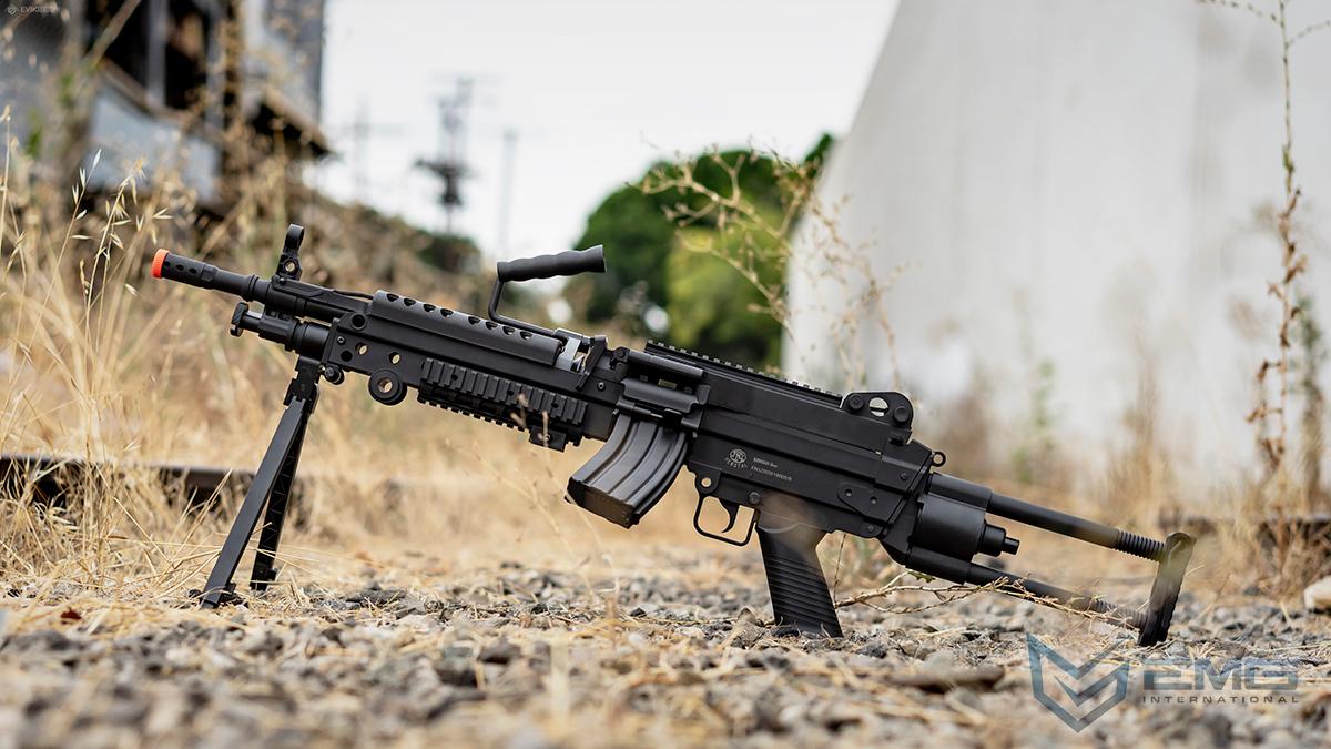 Based on the FN Minimi, the M249 uses a 5.56x45mm NATO cartridge in a belt-fed configuration, supplied from a plastic box magazine. In a pinch, you may also use STANAG compatible M16 magazines in this weapon system. Over the years the M249 has seen quite a few variants, all purpose-tailored to individual's needs.