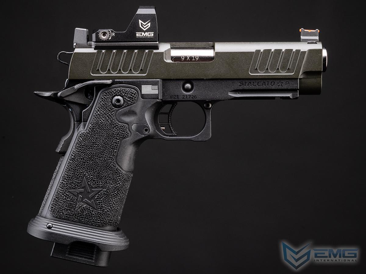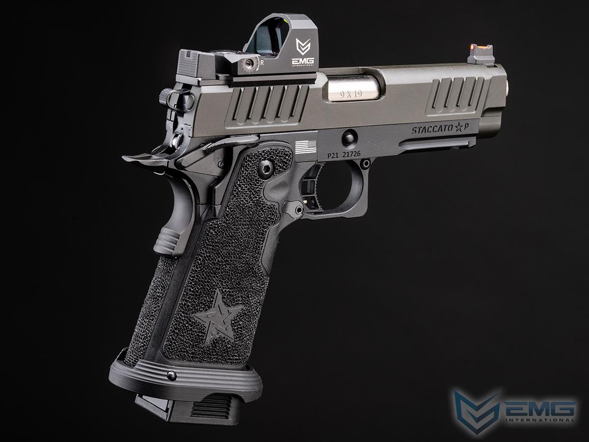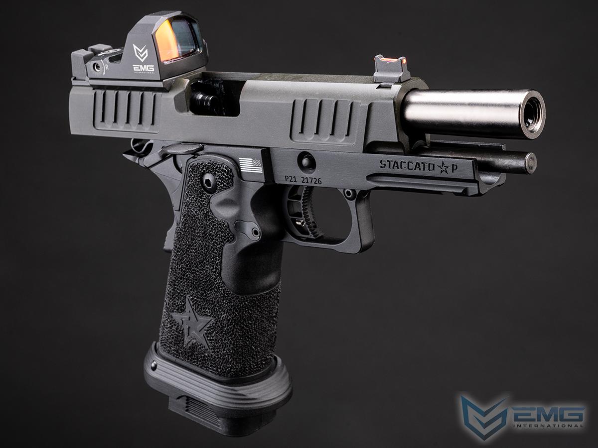 The real Staccato P is approved for duty by more than 1,300+ law enforcement agencies and carried by elite units like the Texas Rangers and the US Marshals Special Operations Group, as well as thousands of officers across the country. The P is finely crafted with wide lightening cuts at the front and rear of the slide providing superior grip while racking it back, reduced recoil and improved cycling speed. The slide is RMR ready and comes with a RMR plate for the installation of your favorite reflex dot sight. Additionally, slide comes equipped with a fiber optic front sight and a tall rear sight that allowing continued functionality when a reflex dot sight is installed. The P metal frame is a robust and nicely weighted for a more realistic look and feel and comes with an under barrel accessory rail for your favorite lights or lasers. Preinstalled is a hand-stippled polymer grip which provides a comfortable and secure hold. Other features include a skeletonized trigger and textured trigger guard continuing to provide more stability while firing. The icing on this cake is the authentic licensed logos, patterns and roll marks of Staccato.