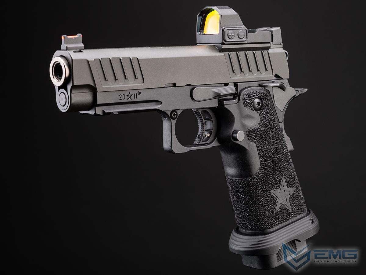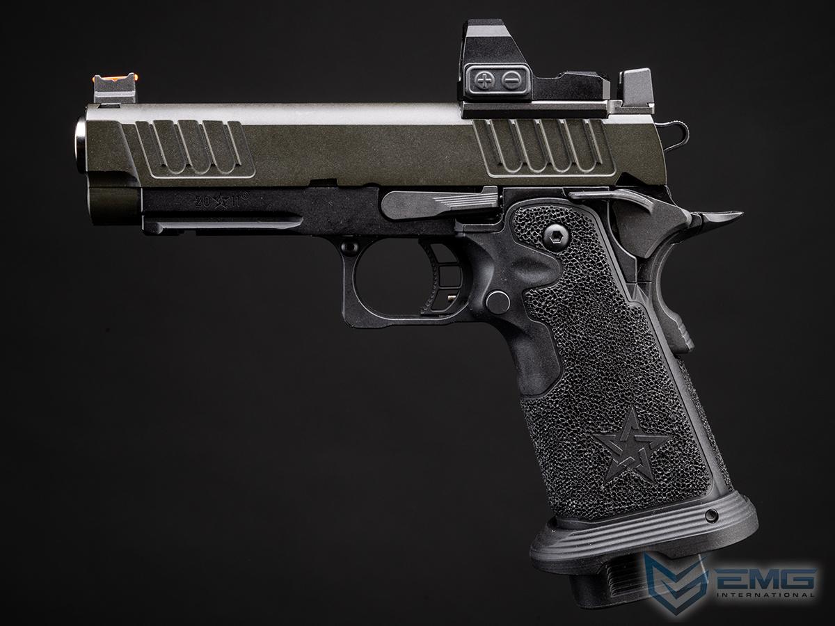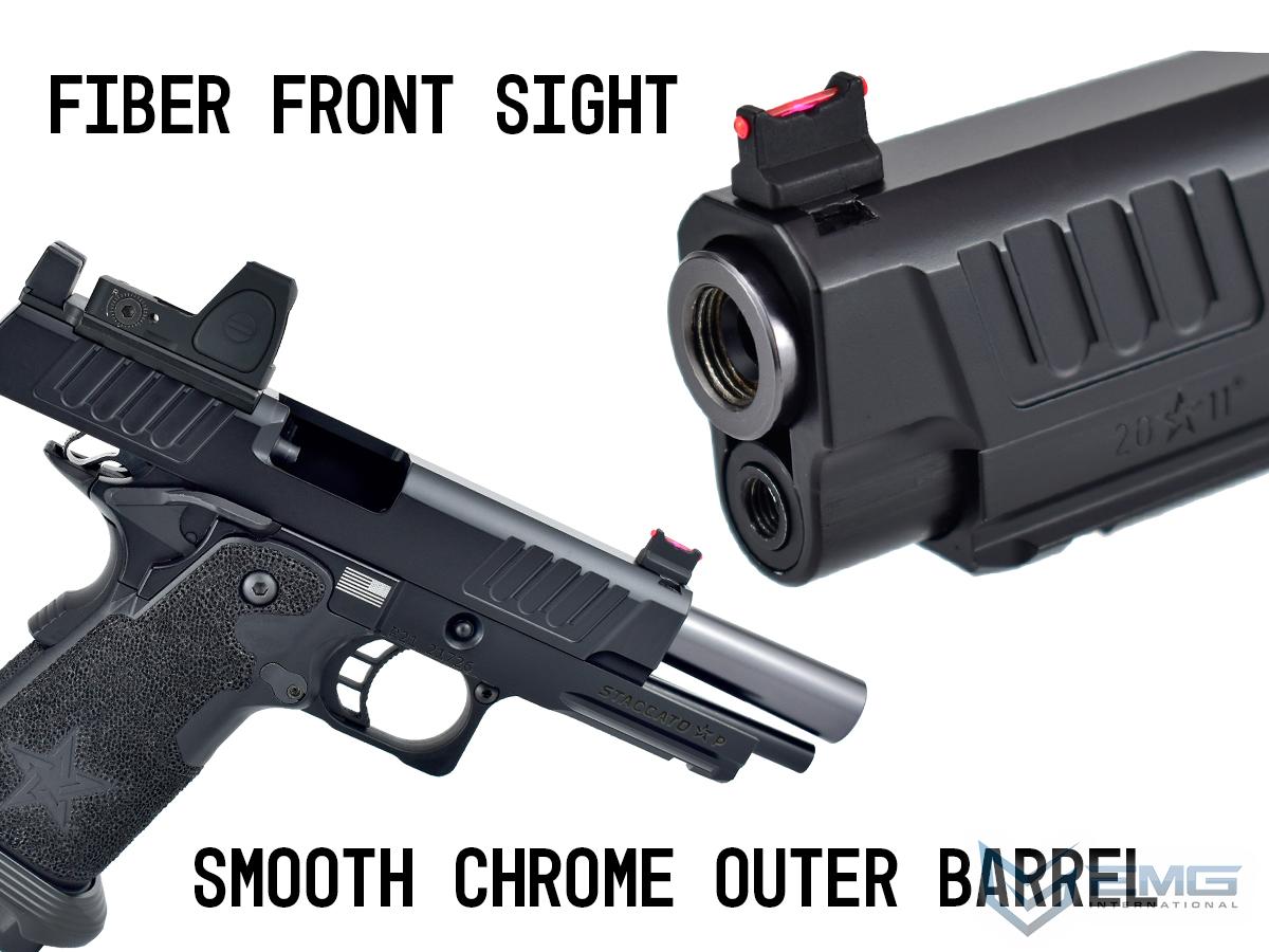 The real Staccato P is approved for duty by more than 1,300+ law enforcement agencies and carried by elite units like the Texas Rangers and the US Marshals Special Operations Group, as well as thousands of officers across the country. The P is finely crafted with wide lightening cuts at the front and rear of the slide providing superior grip while racking it back, reduced recoil and improved cycling speed. The slide is RMR ready and comes with a RMR plate for the installation of your favorite reflex dot sight. Additionally, slide comes equipped with a fiber optic front sight and a tall rear sight that allowing continued functionality when a reflex dot sight is installed. The P metal frame is a robust and nicely weighted for a more realistic look and feel and comes with an under barrel accessory rail for your favorite lights or lasers. Preinstalled is a hand-stippled polymer grip which provides a comfortable and secure hold. Other features include a skeletonized trigger and textured trigger guard continuing to provide more stability while firing. The icing on this cake is the authentic licensed logos, patterns and roll marks of Staccato.