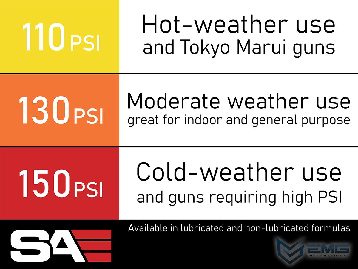 - Higher pressure gas 130 PSI is a high pressure gas, perfect for GBBR replicas requiring high power to cycle properly